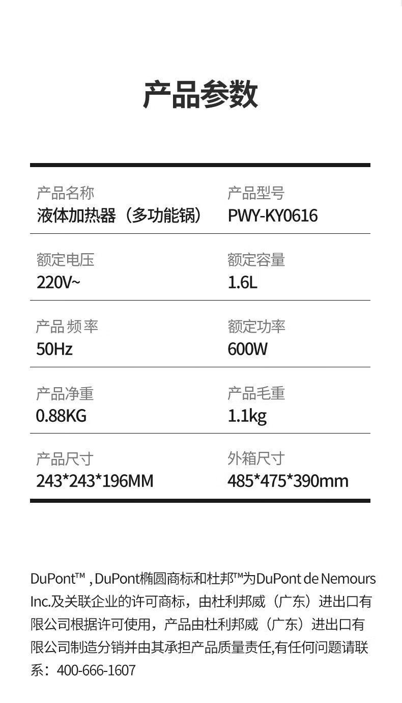 杜邦(DUPONT)液体加热器(多功能微压锅)PWY-KY0616