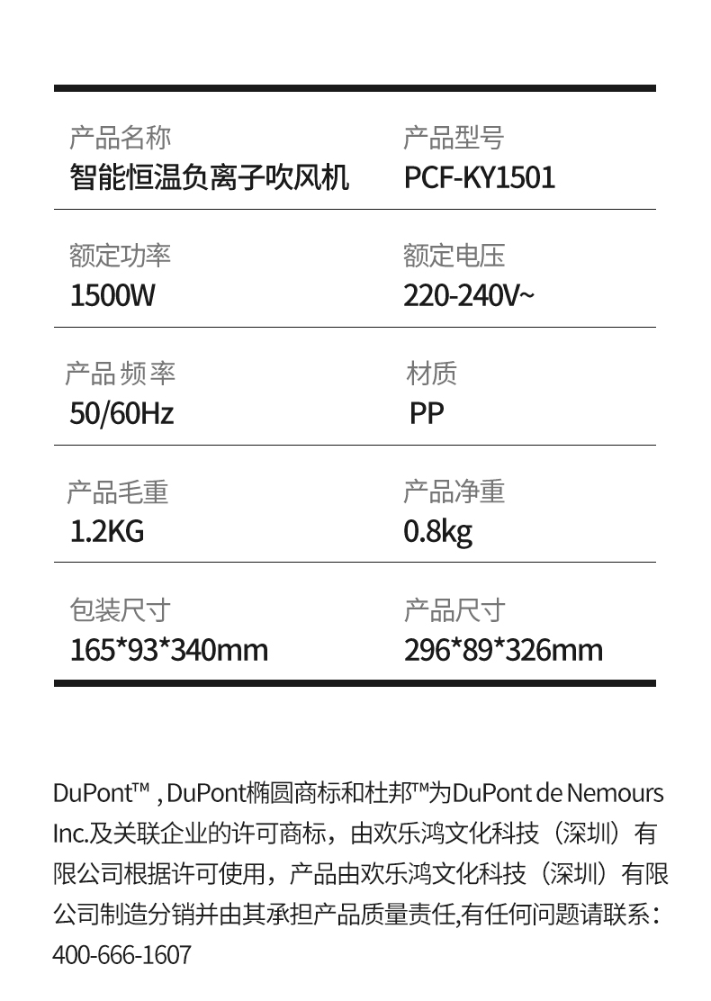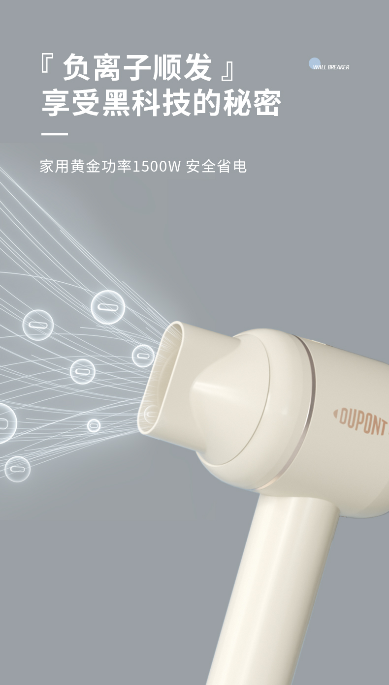 杜邦DUPONT智能恒温负离子吹风机3档热风1500W