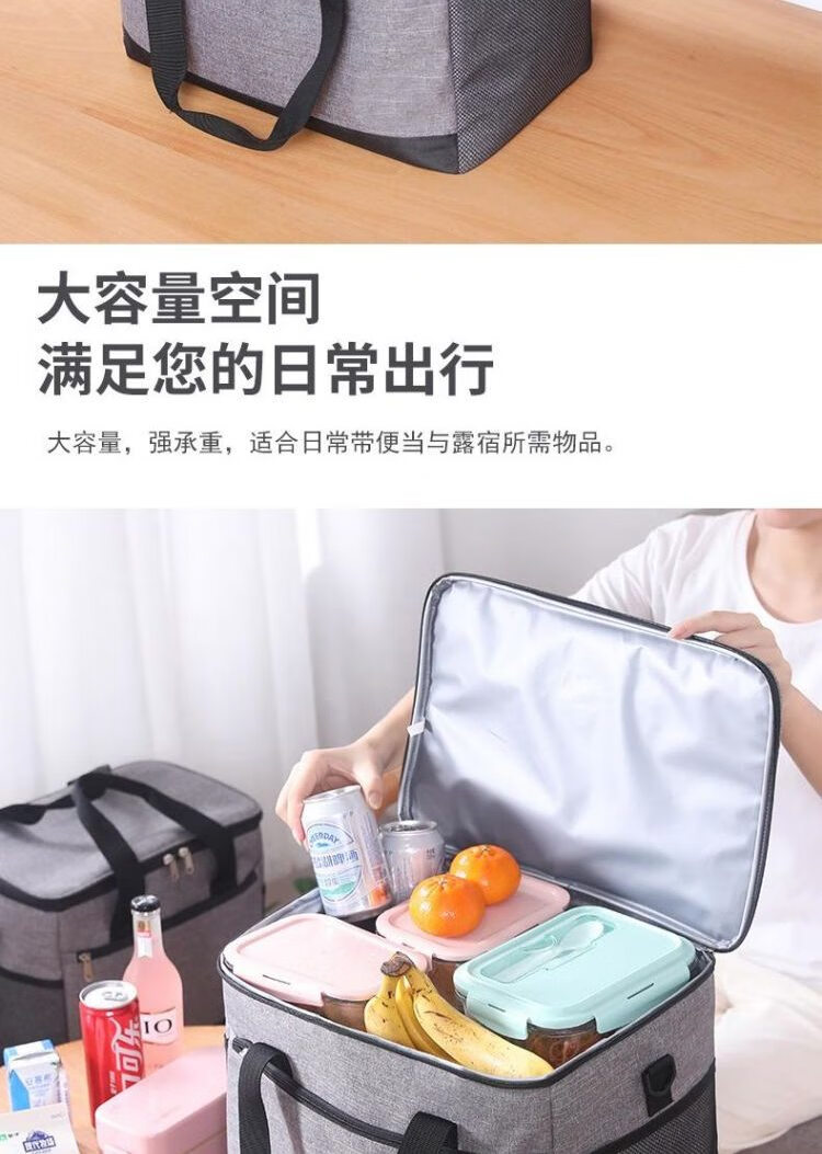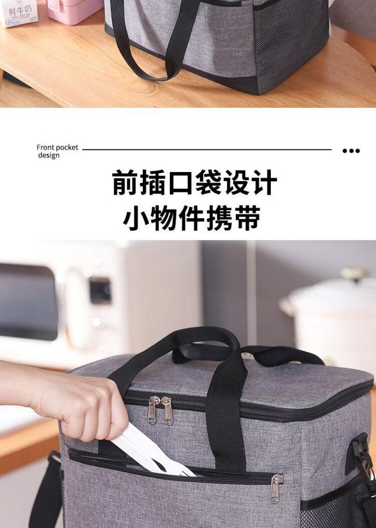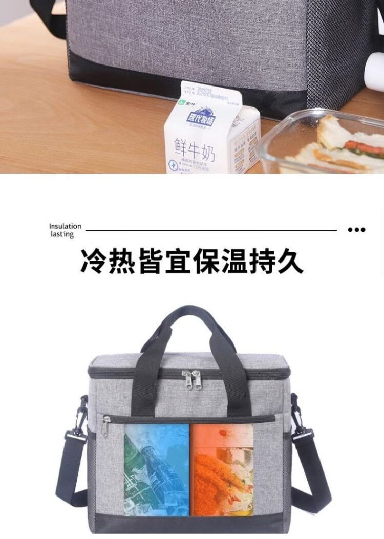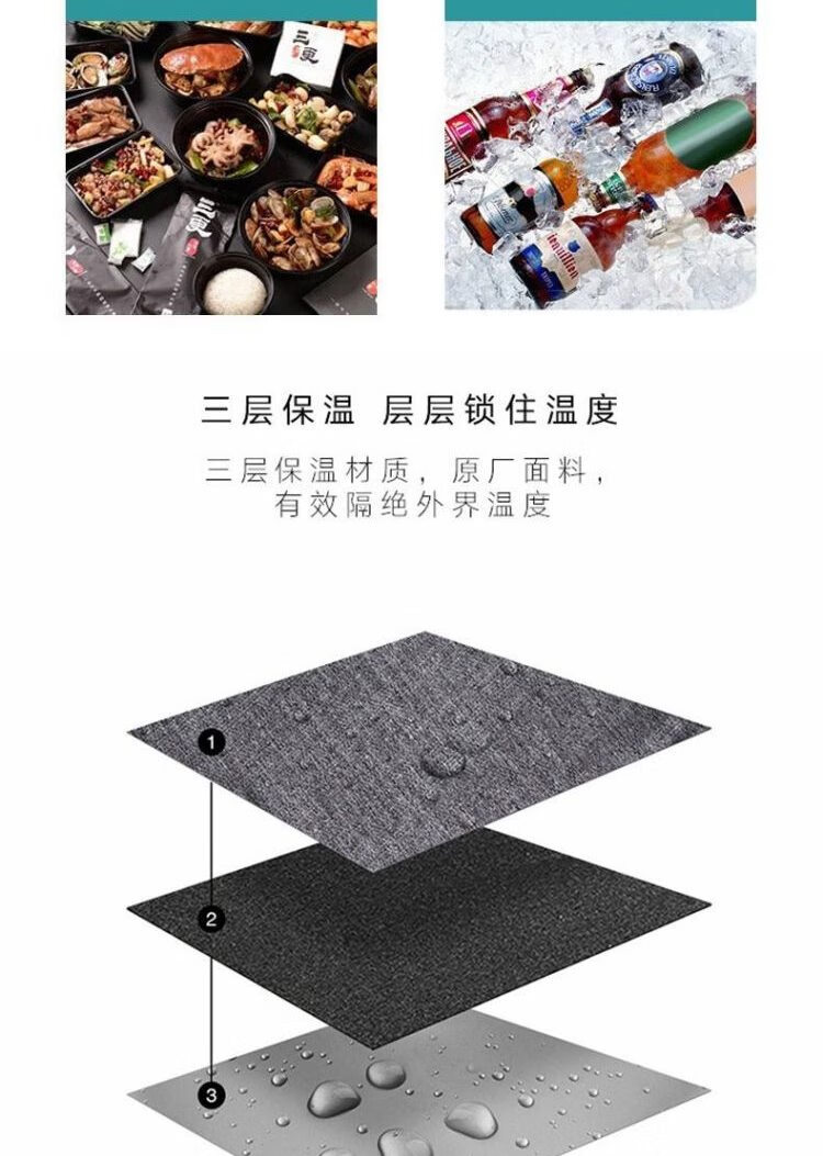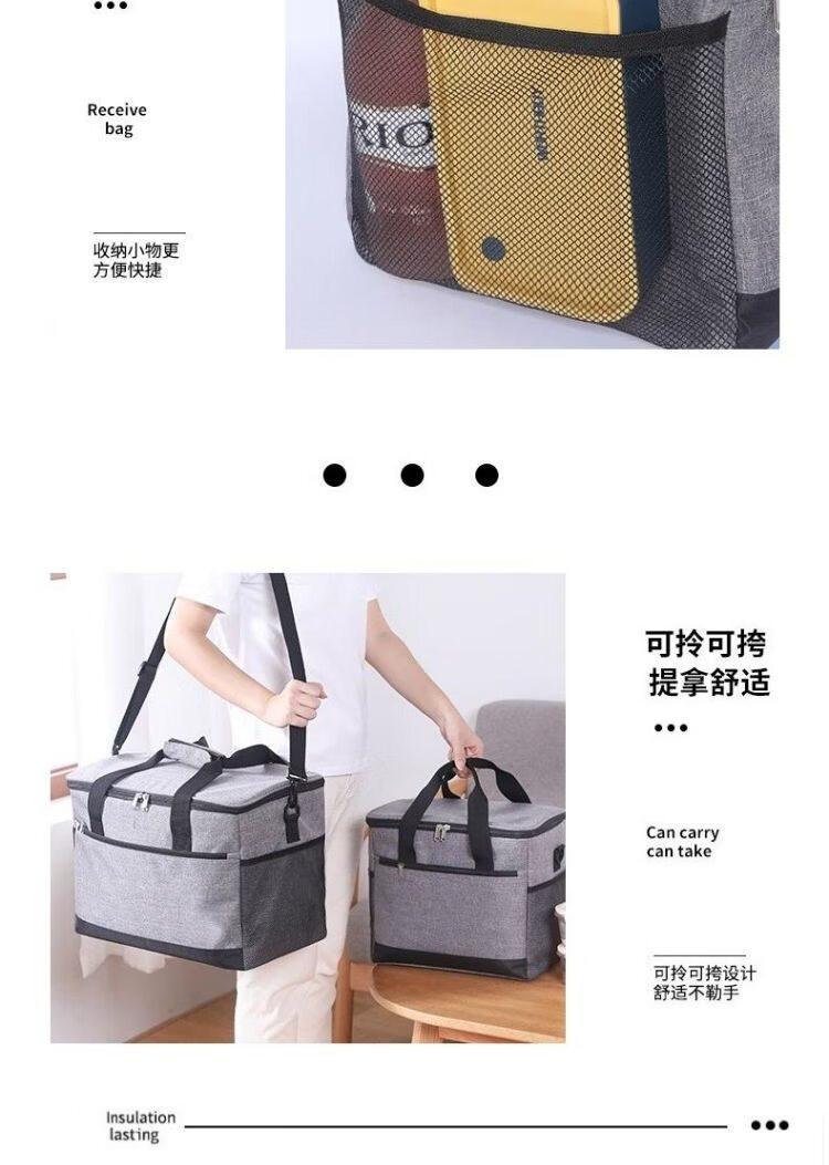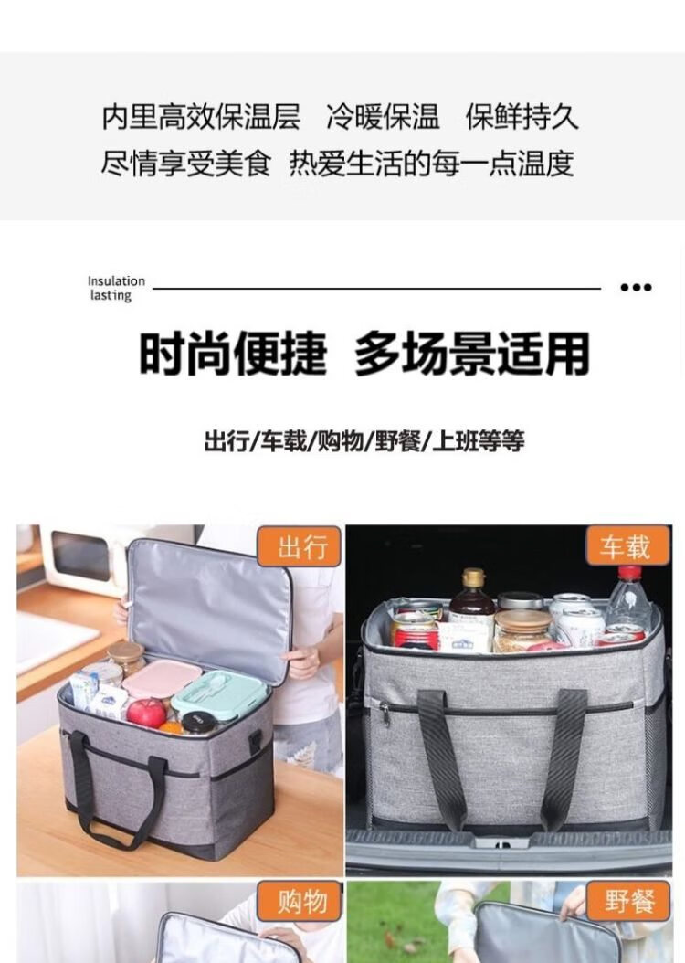 1、产品设计新颖,无需用电,节能低碳,保温保冷保鲜;2、采用平整抗皱阳离子牛津布面料,耐磨耐用,牢固结实;3、中间层采用加厚加密珍珠棉,配合PEVA内膜,采用热电压工艺,超强防水、高效保温;4、多层多袋设计,带侧兜,大容量,装的更多;5、手提带加长肩带设计,可背可提,使用方便;6、可折叠收纳,不使用时不占用空间;7、多场景多用途,适用于车用、家用、医用,是您旅游、运动、 购物等冷藏或保温食品的最佳选择。
