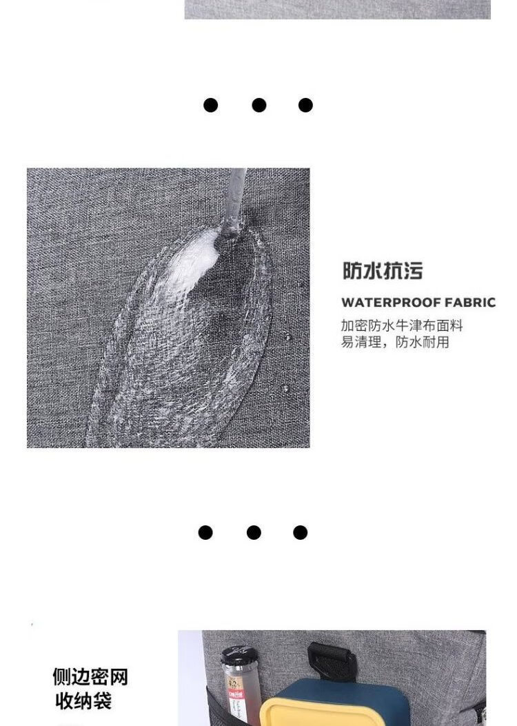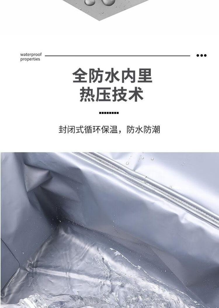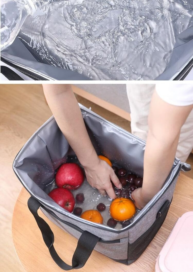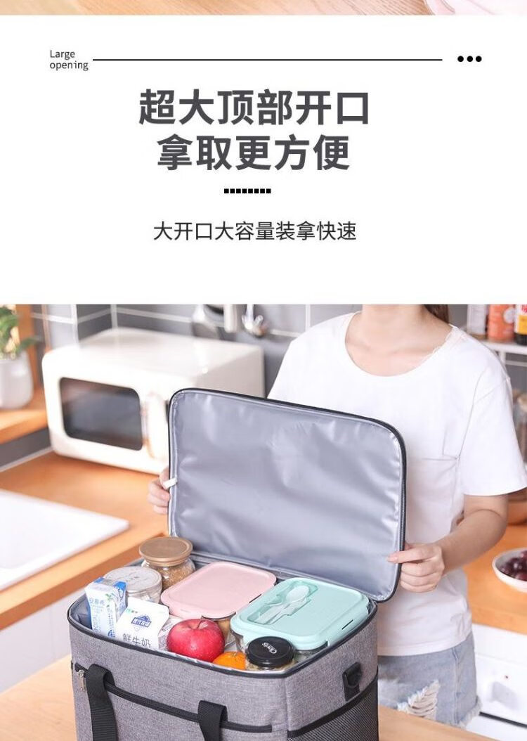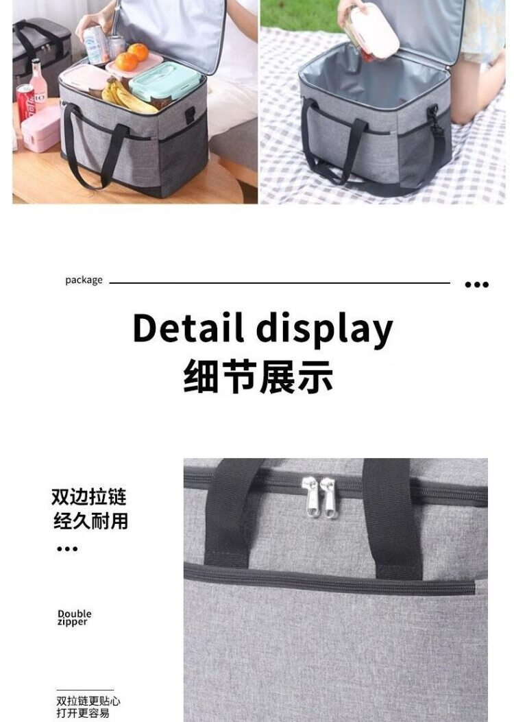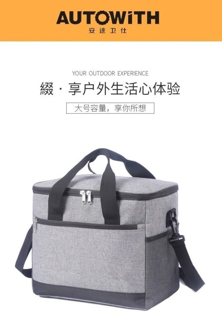 1、产品设计新颖,无需用电,节能低碳,保温保冷保鲜;2、采用平整抗皱阳离子牛津布面料,耐磨耐用,牢固结实;3、中间层采用加厚加密珍珠棉,配合PEVA内膜,采用热电压工艺,超强防水、高效保温;4、多层多袋设计,带侧兜,大容量,装的更多;5、手提带加长肩带设计,可背可提,使用方便;6、可折叠收纳,不使用时不占用空间;7、多场景多用途,适用于车用、家用、医用,是您旅游、运动、 购物等冷藏或保温食品的最佳选择。