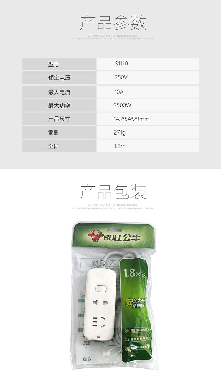 【公牛S1110】公牛 S1110 新国标插座 插排 拖线板 总控 1.8米