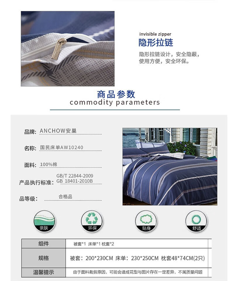 安巢家居(ANCHOW)床上四件套双人被套200x230cm床单枕套 国民床单AW10240 200_230