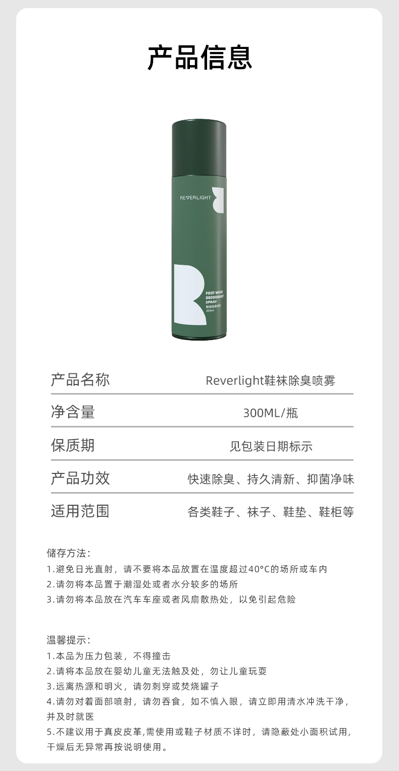 Reverlight露清野鞋袜除臭剂除臭持久清香