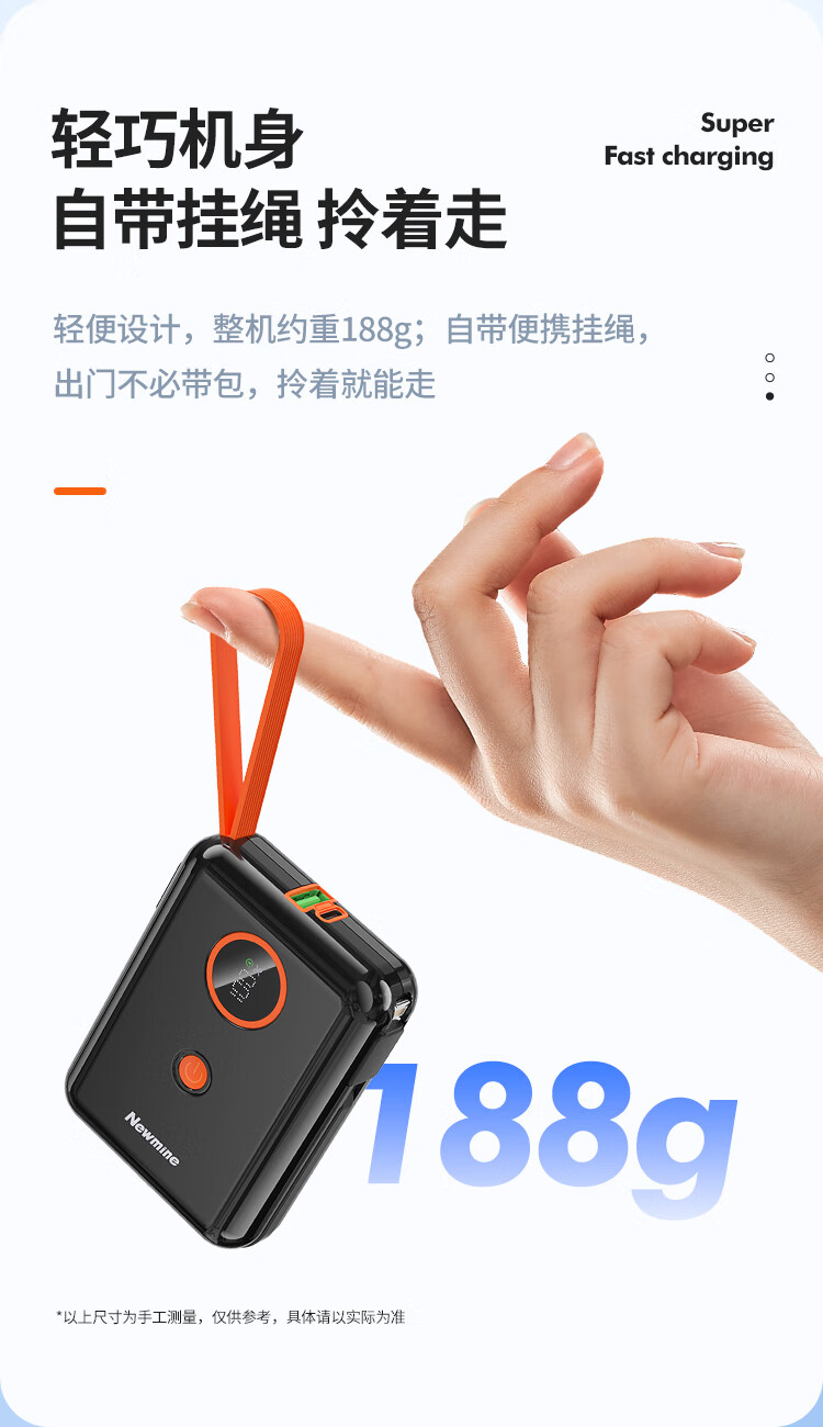 纽曼(Newmine)自带线充电宝22.5W快充10000毫安时移动电源大容量小巧便携适用华为苹果小米手机平板通用白