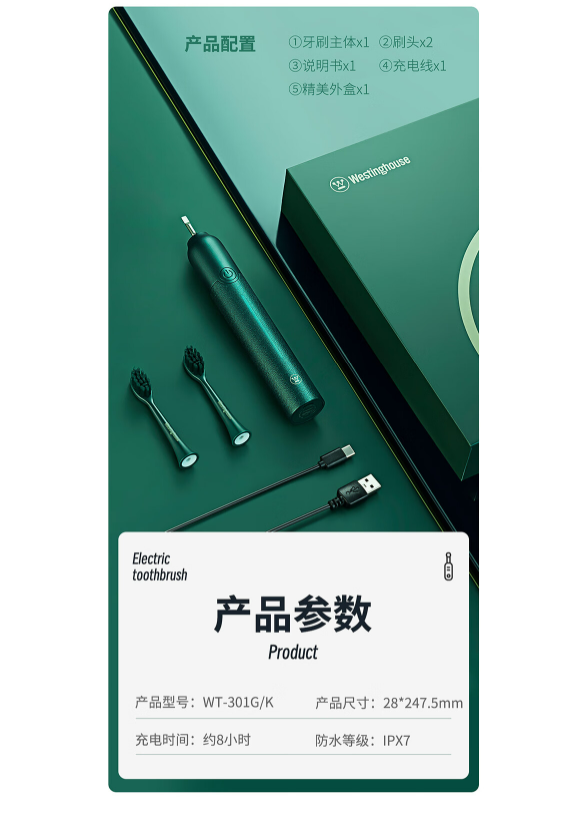 西屋(Westinghouse) 成人声波电动牙刷软毛女士情侣牙刷送女友男友WT-301G/K