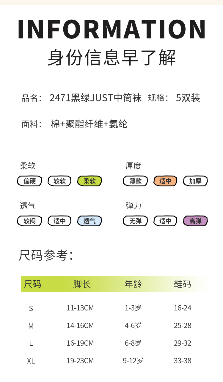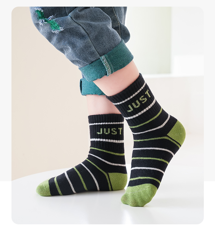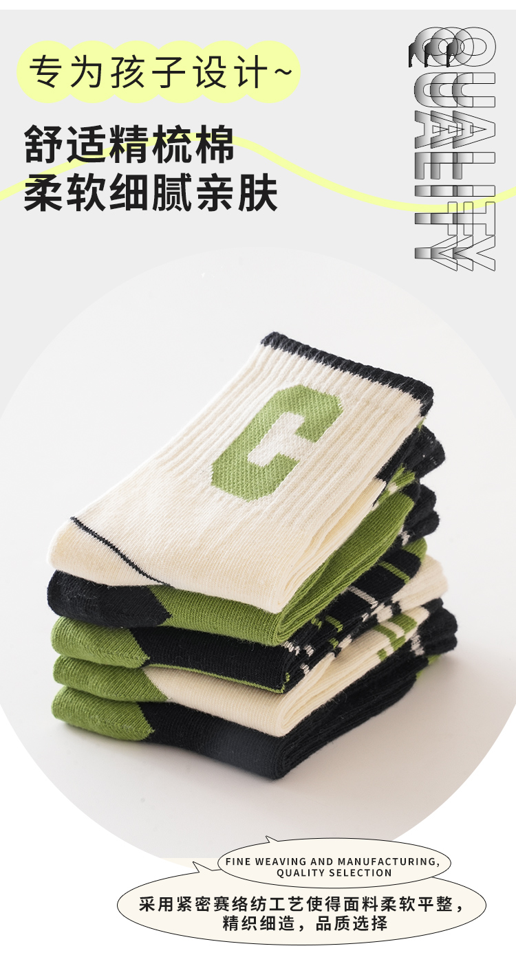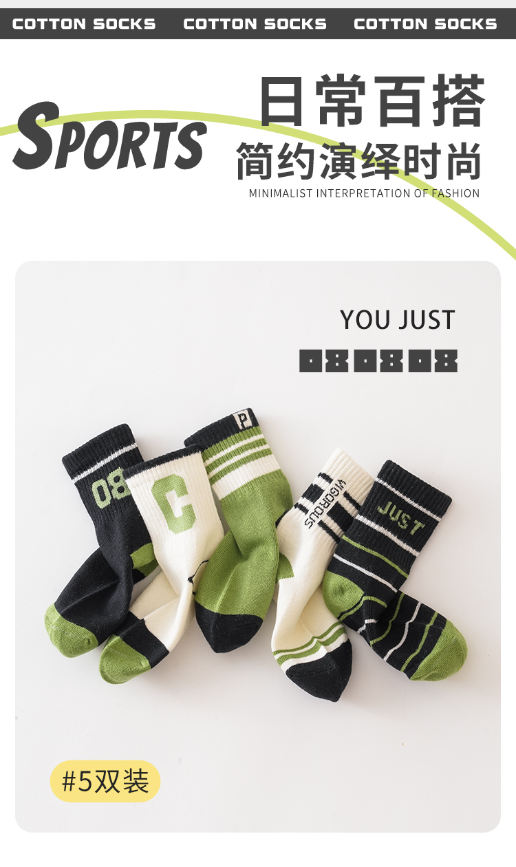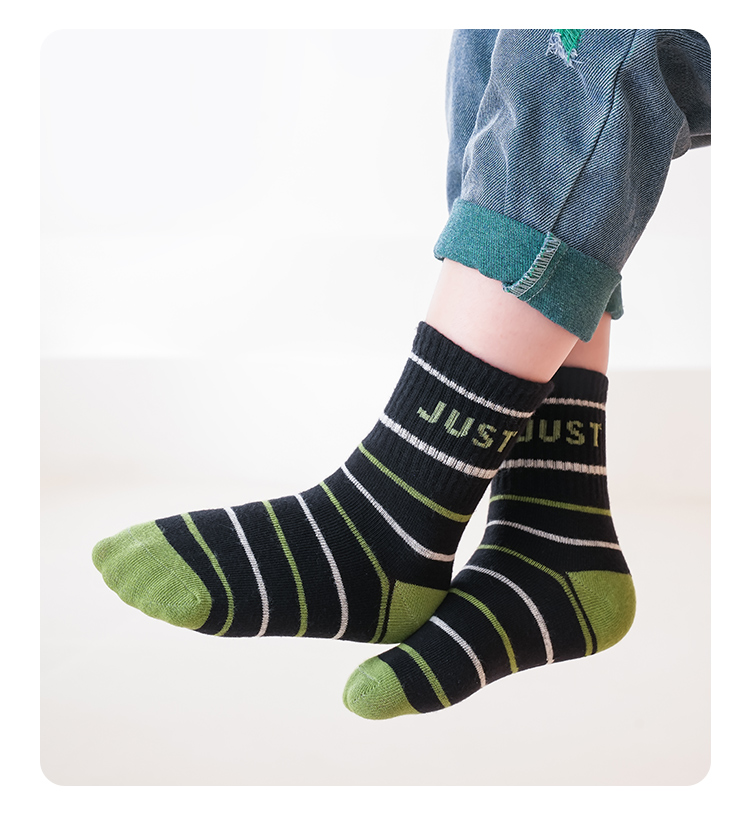 花辞日记儿童无骨袜2471黑绿色JUST中筒袜5色5双装