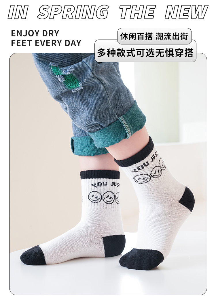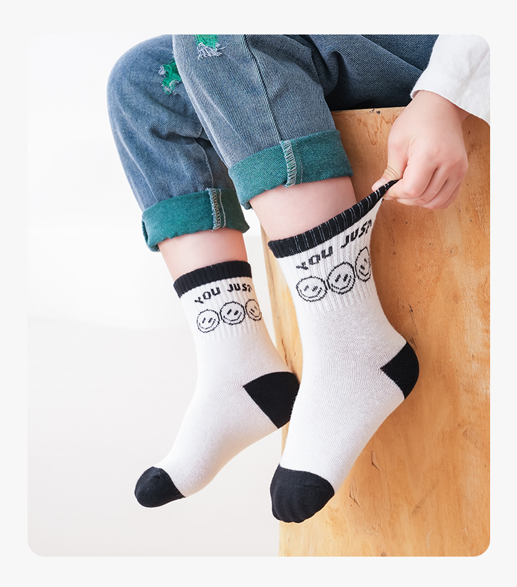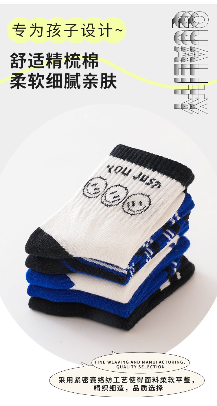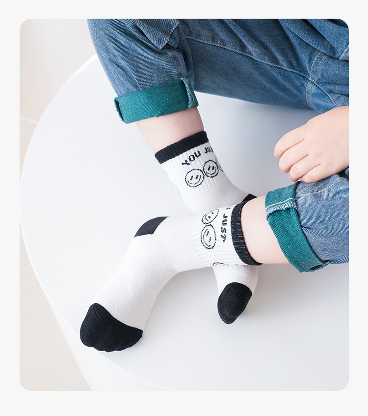 花辞日记儿童无骨袜蓝黑色笑脸中筒袜5色5双装