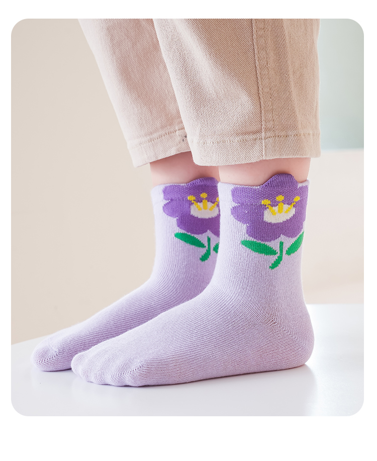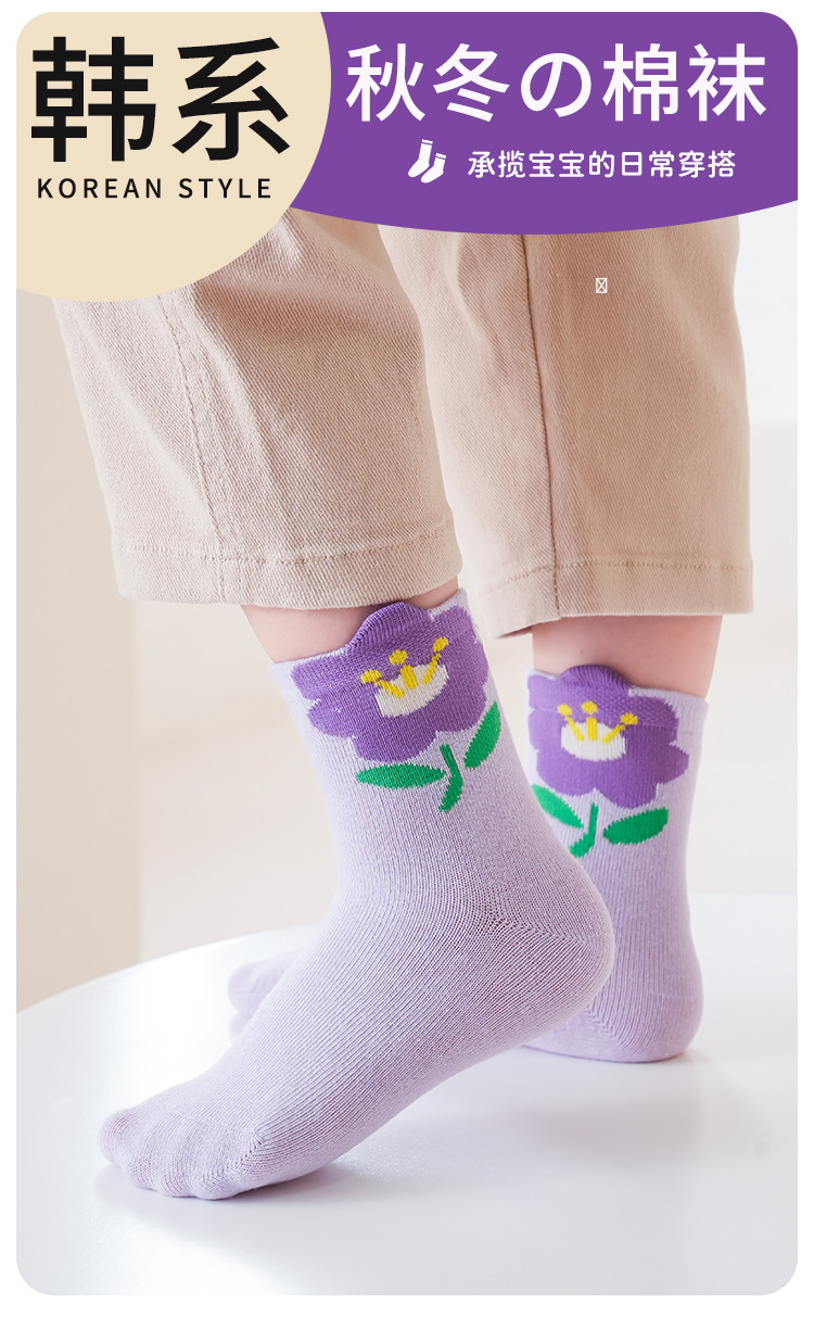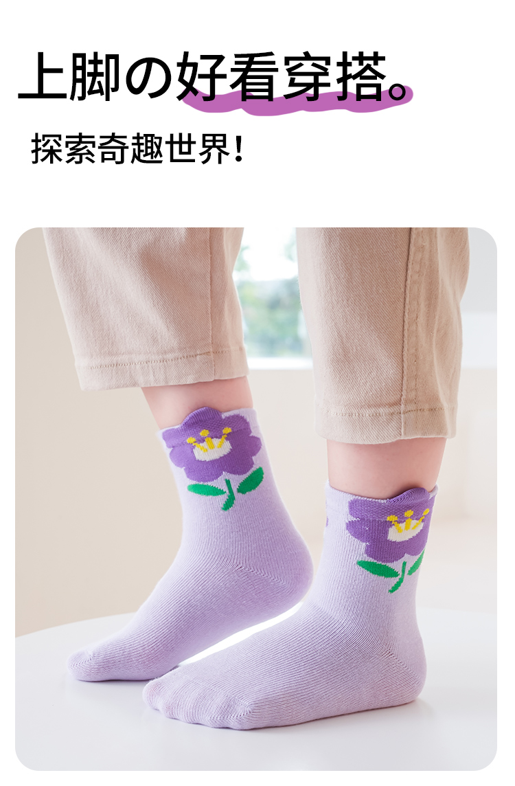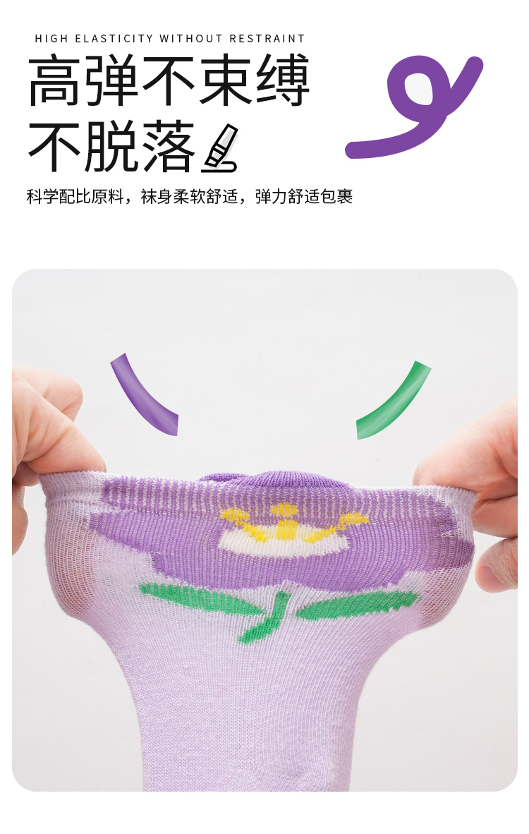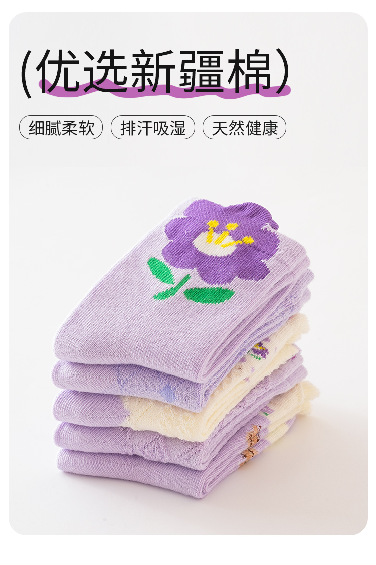 花辞日记儿童无骨袜子2474紫色系花朵中筒袜5色组合