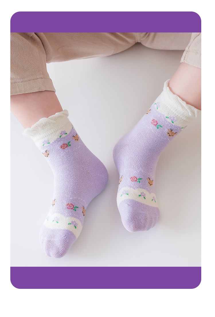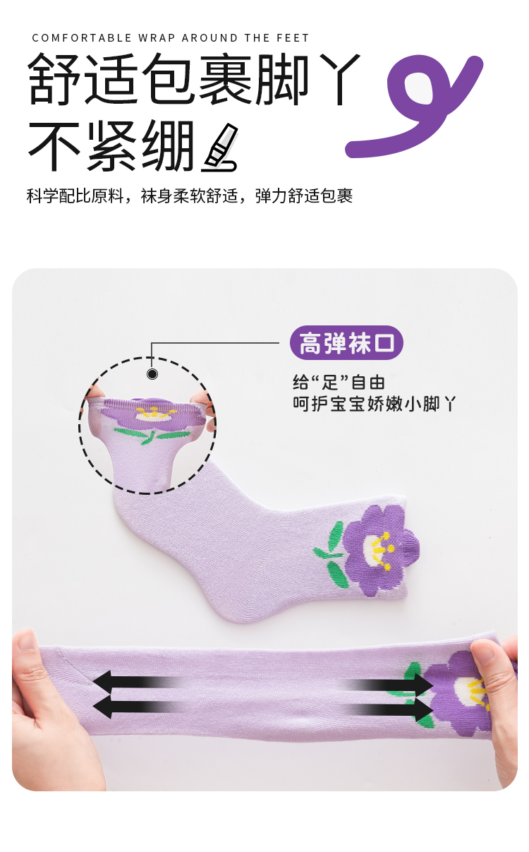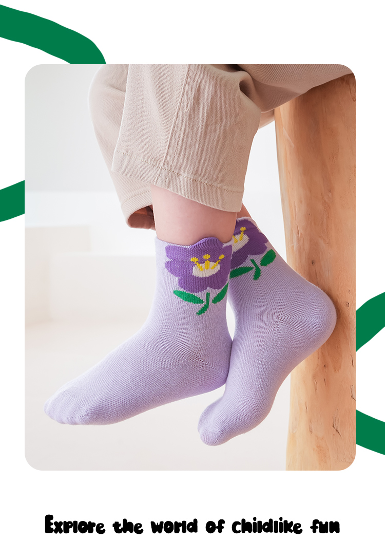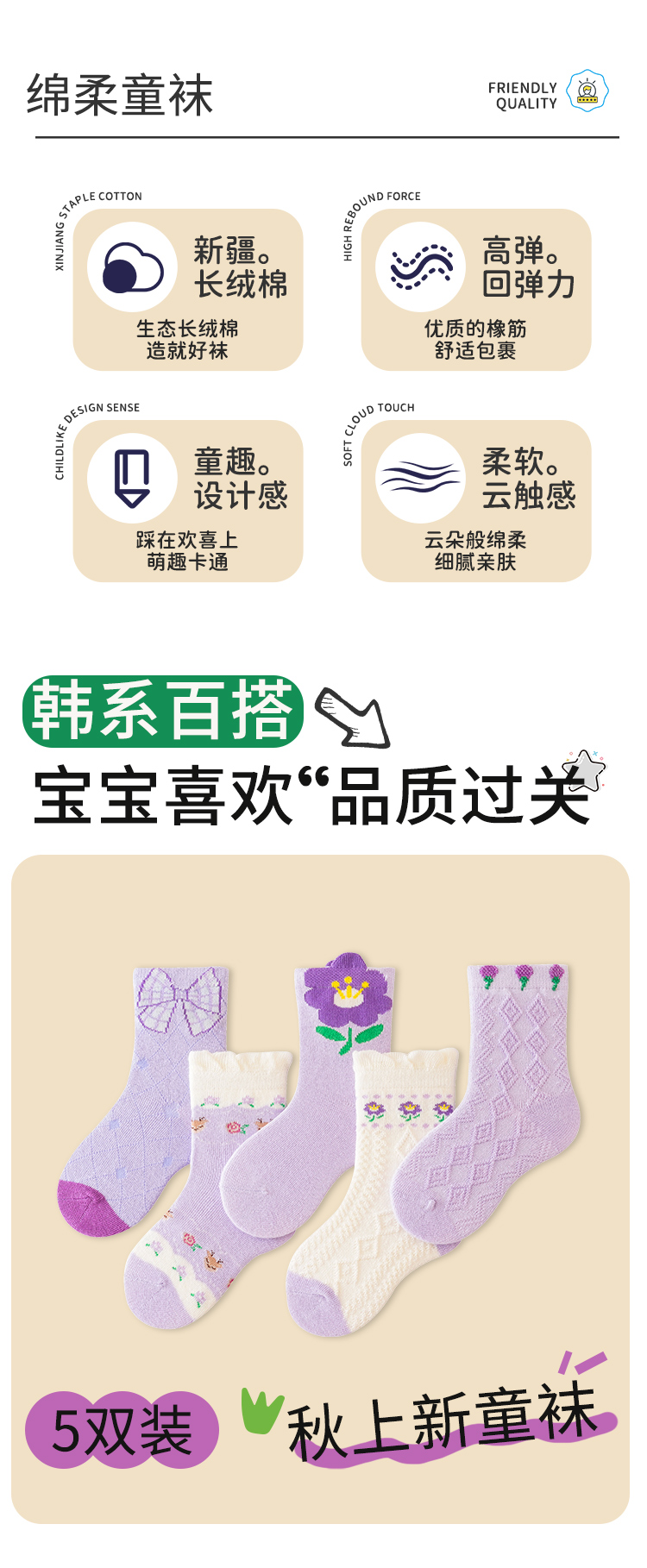 花辞日记儿童无骨袜子2474紫色系花朵中筒袜5色组合