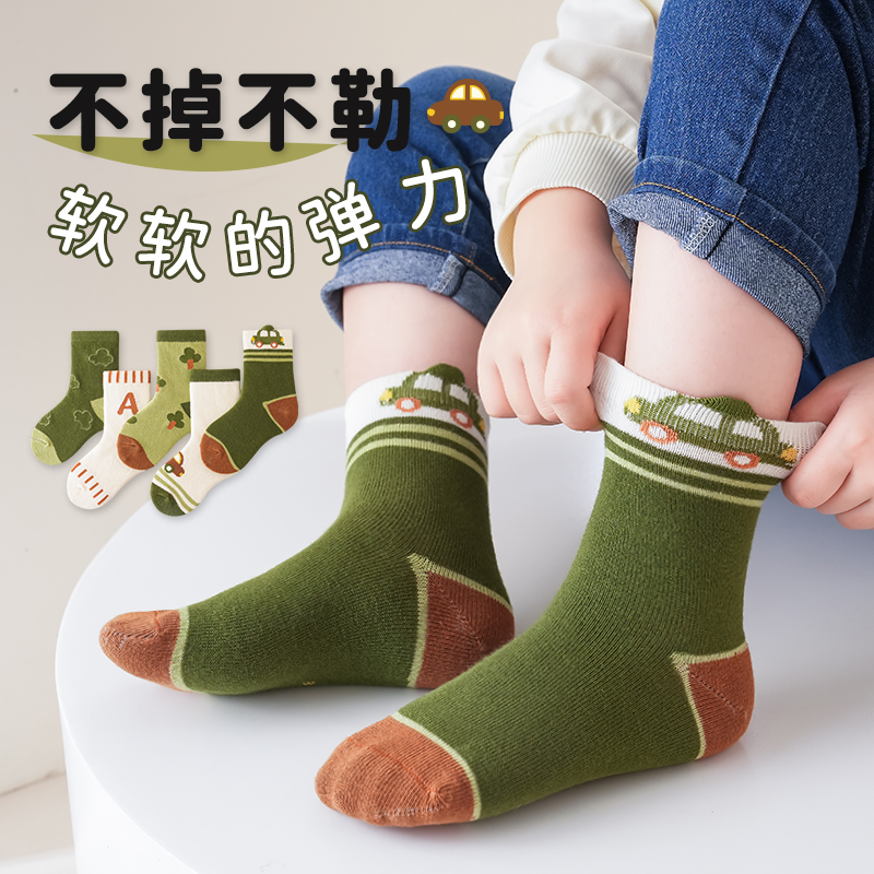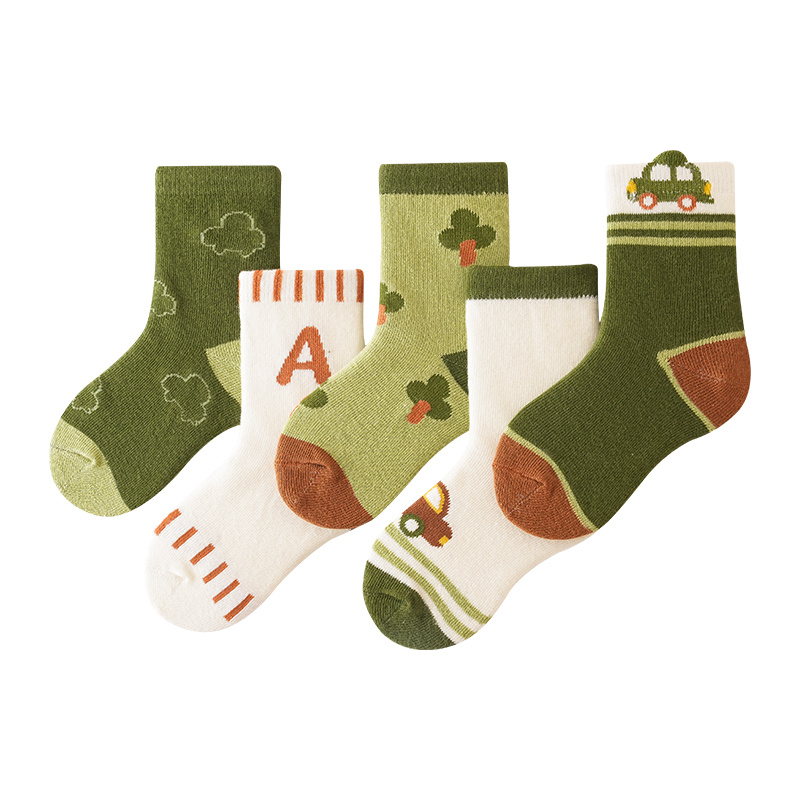 花辞日记儿童无骨袜子绿色小汽车中筒袜5色组合