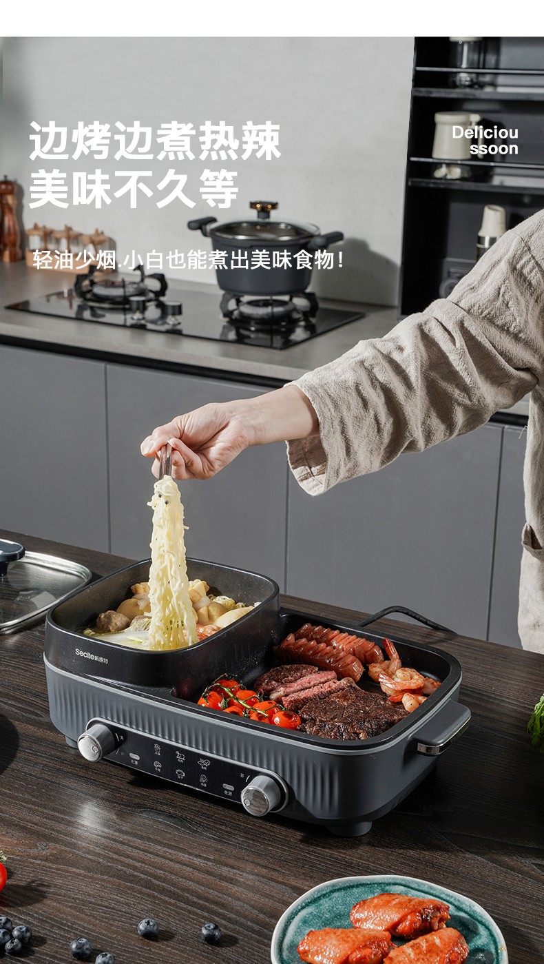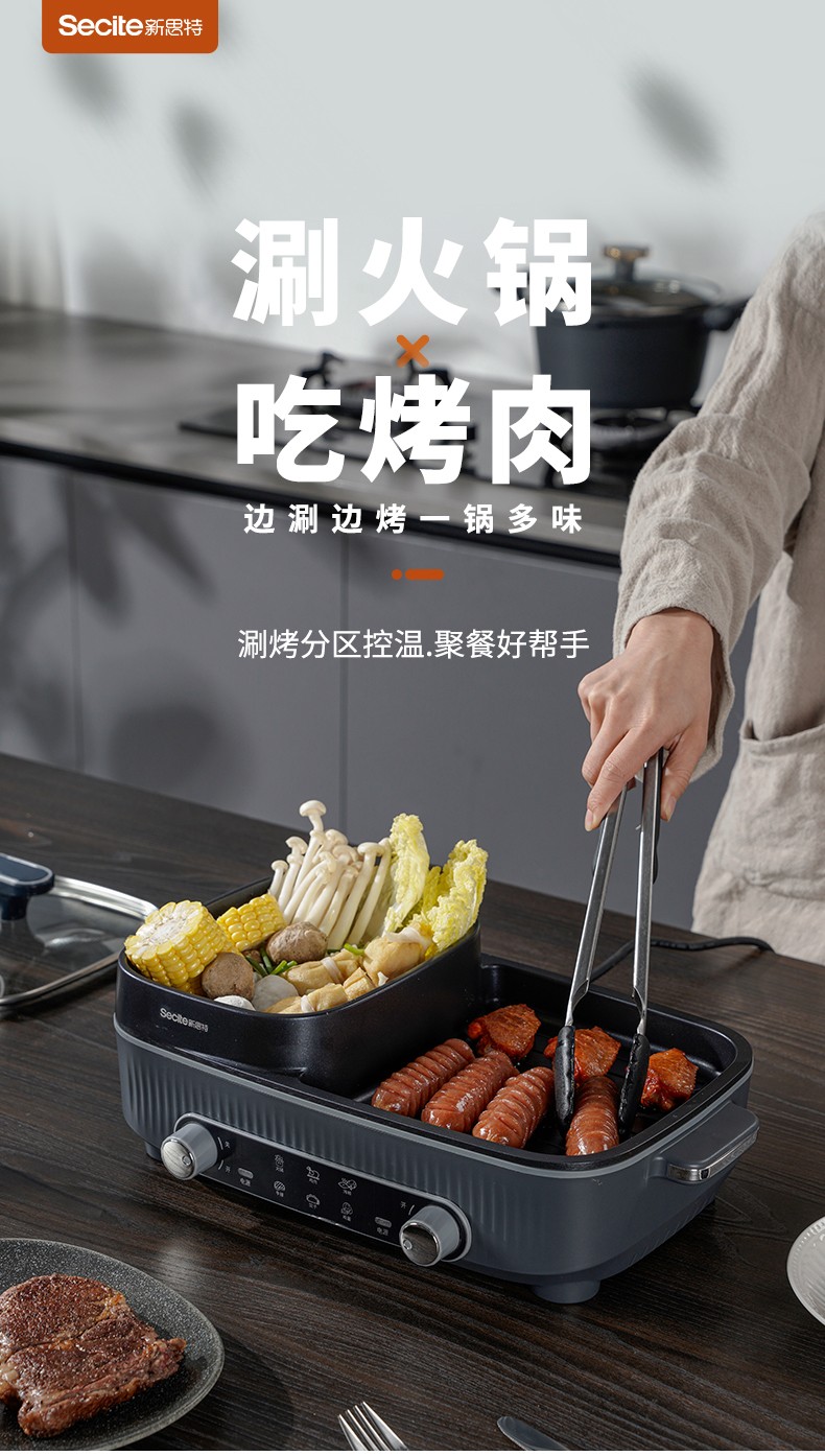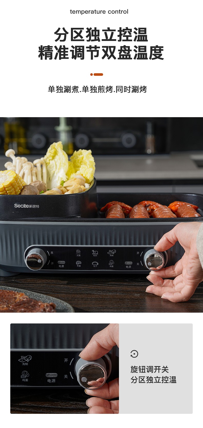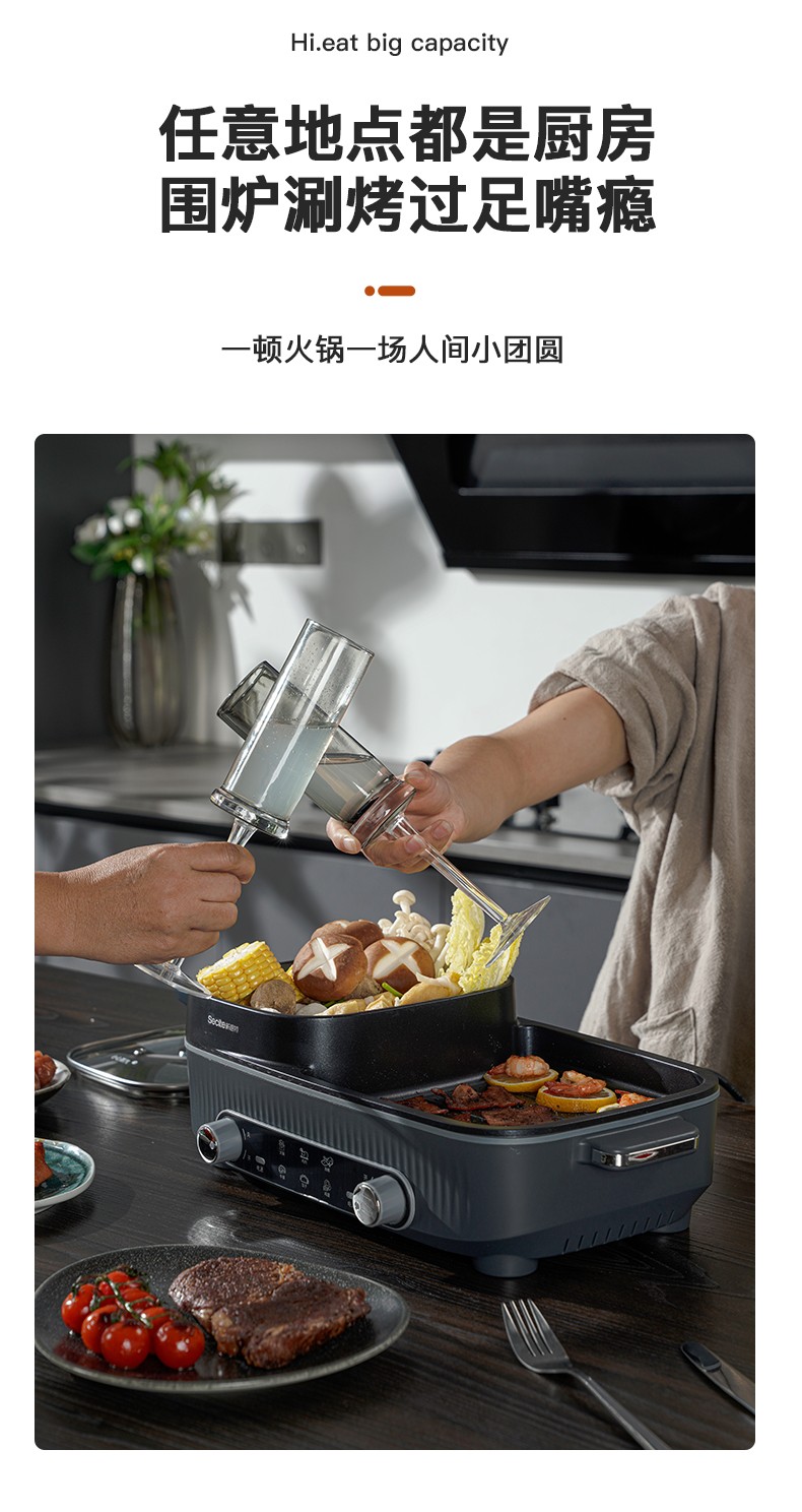 新思特G-41涮烤一体锅多功能锅煎炸焖煮炖炒蒸涮烤一体电热锅小型火锅烧烤机 高级灰