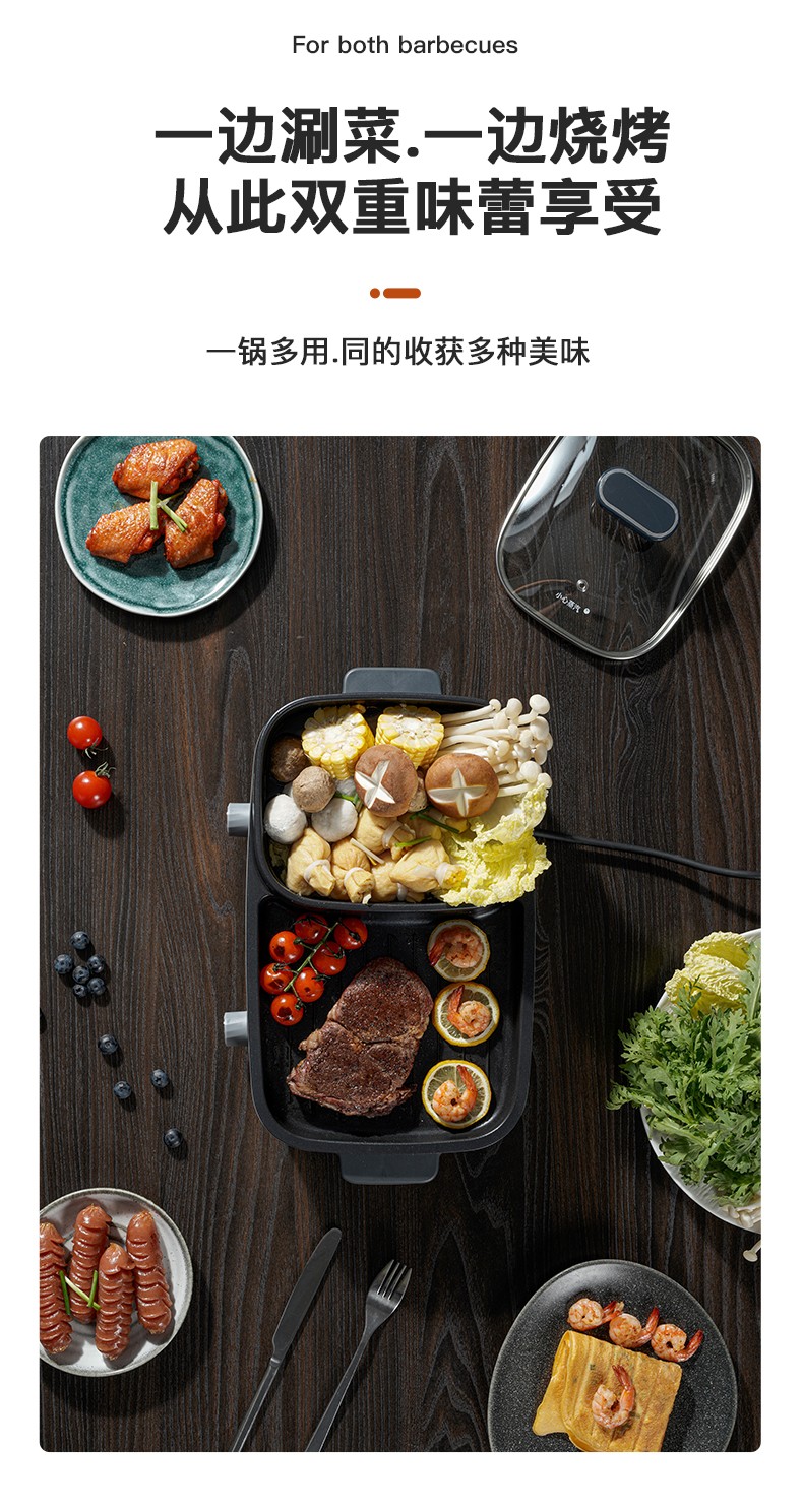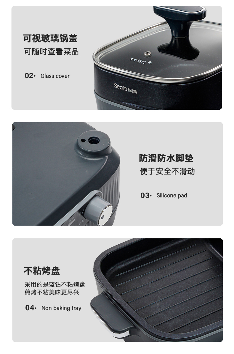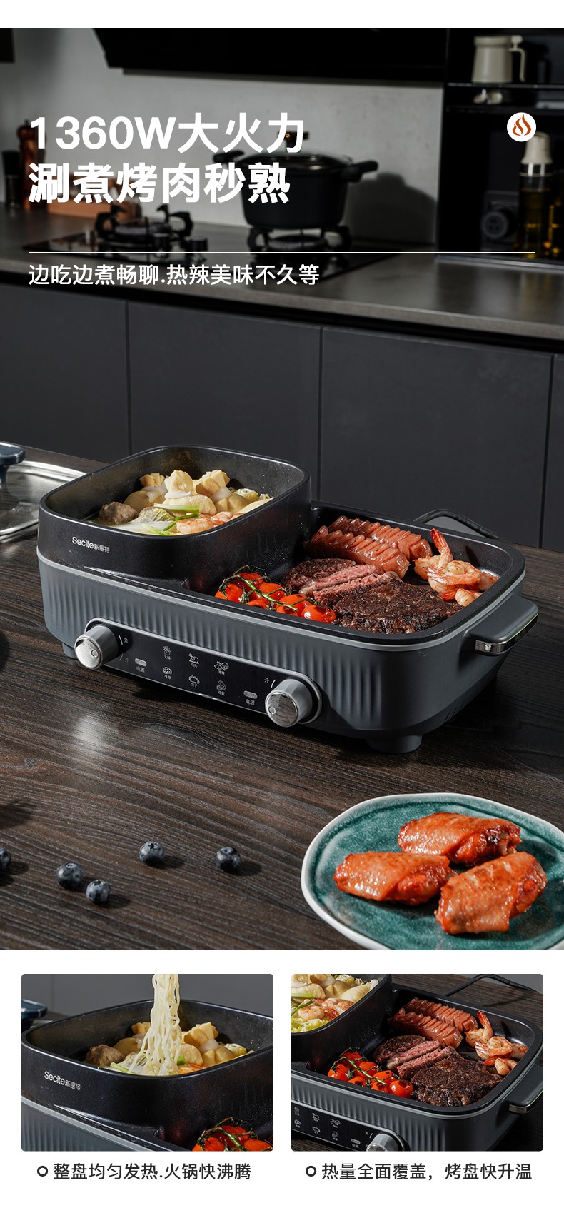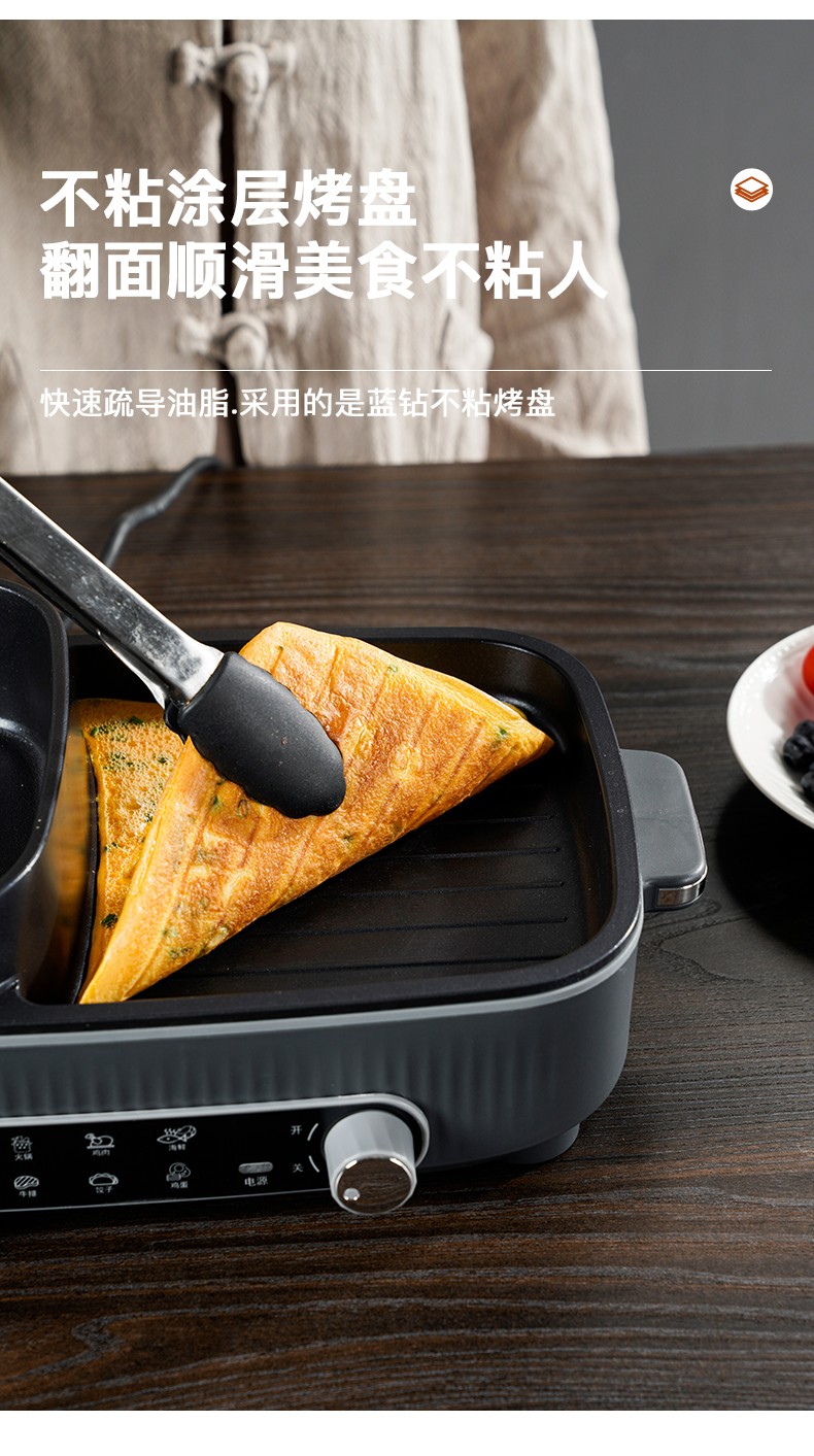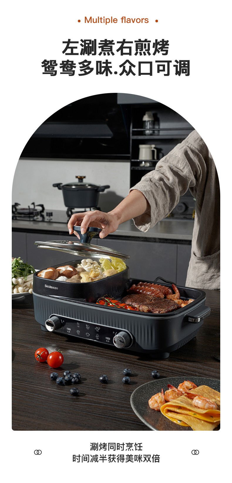 新思特G-41涮烤一体锅多功能锅煎炸焖煮炖炒蒸涮烤一体电热锅小型火锅烧烤机 高级灰