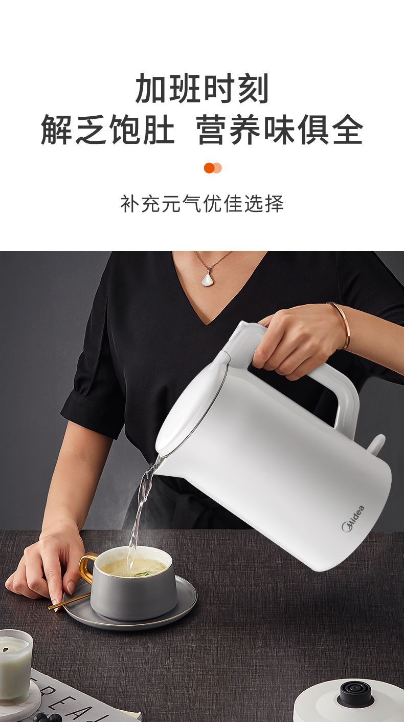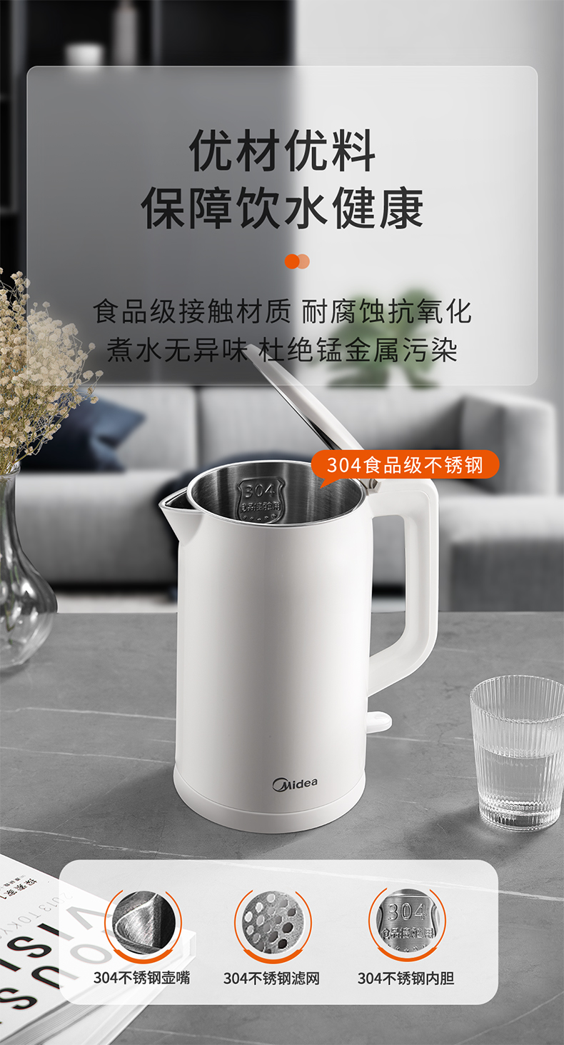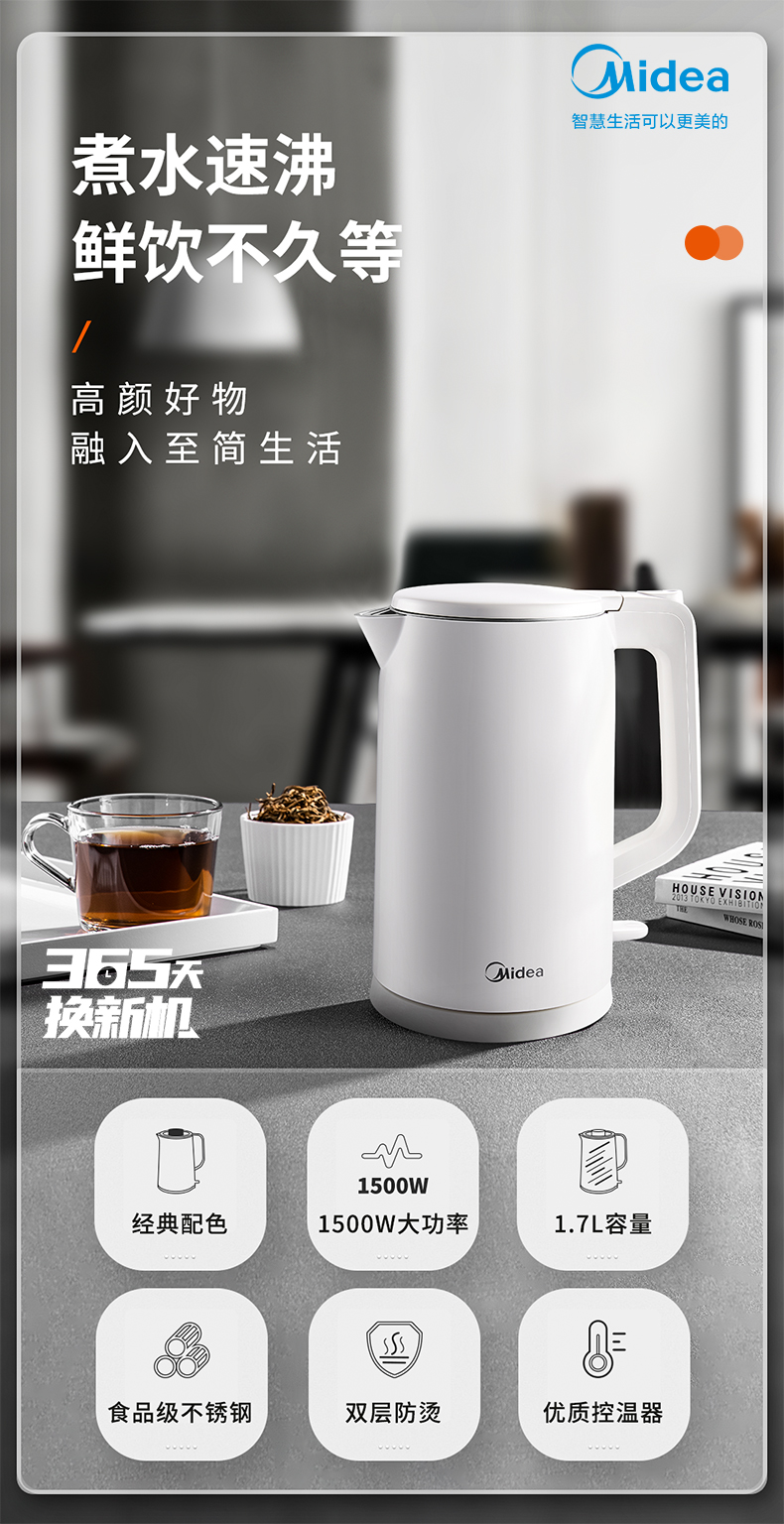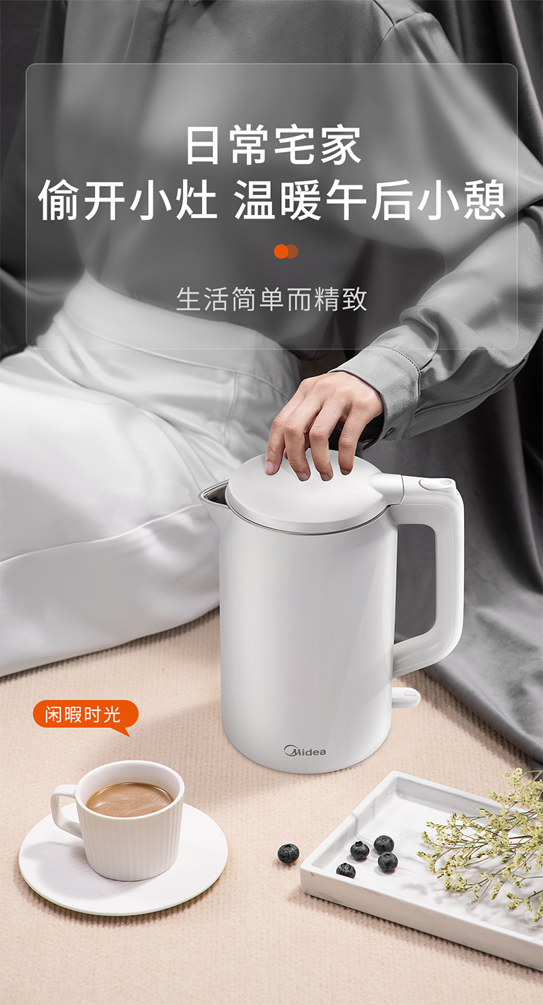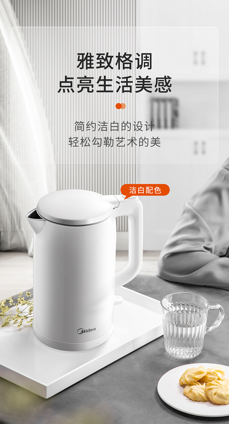 美的MK-AEK1769电热水壶 1.7L双层防烫家用烧水壶开水壶