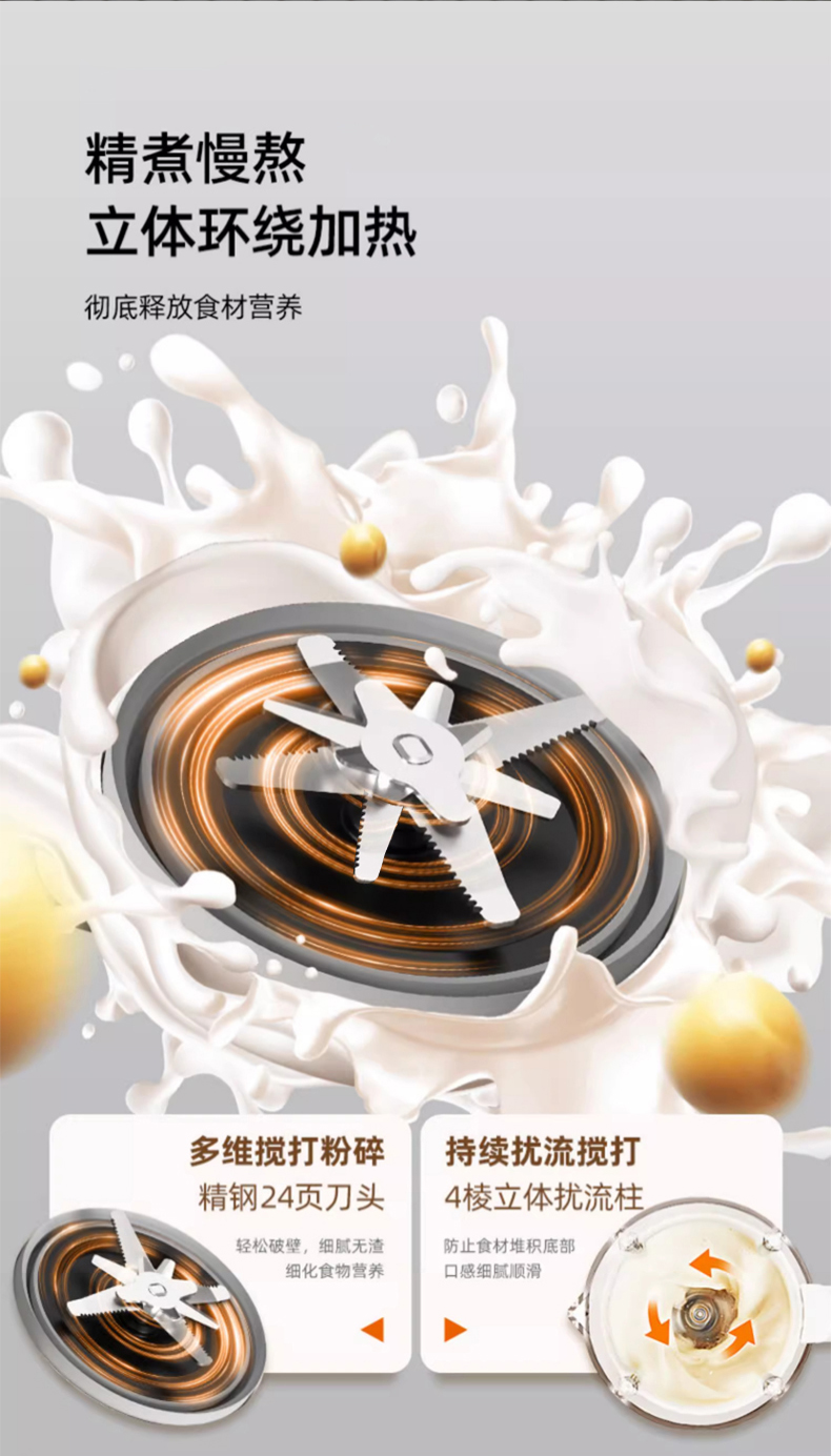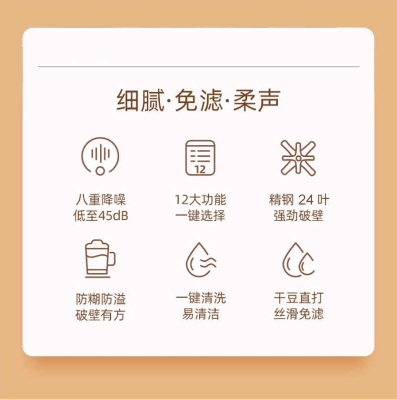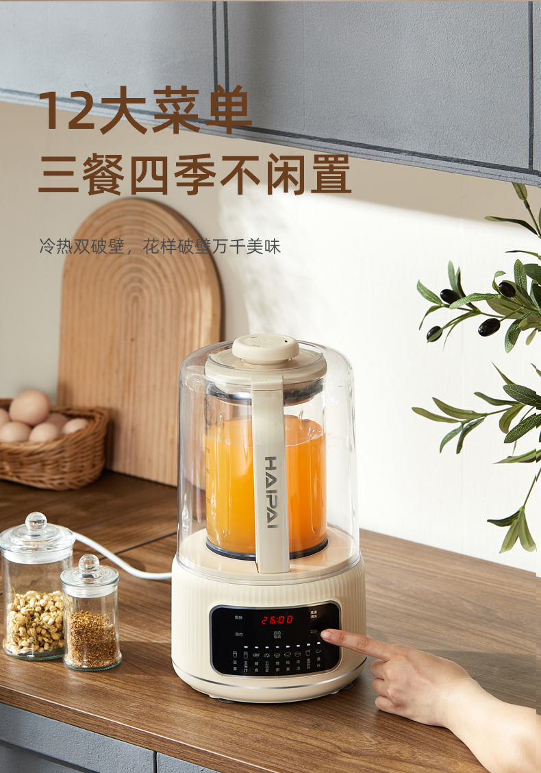 12大菜单,豆浆,玉米汁,辅食,五谷浆,绵粥,炖煮,浓汤,果蔬奶昔,酱料,搅拌,预约,高温清洗,三餐四季不闲置。