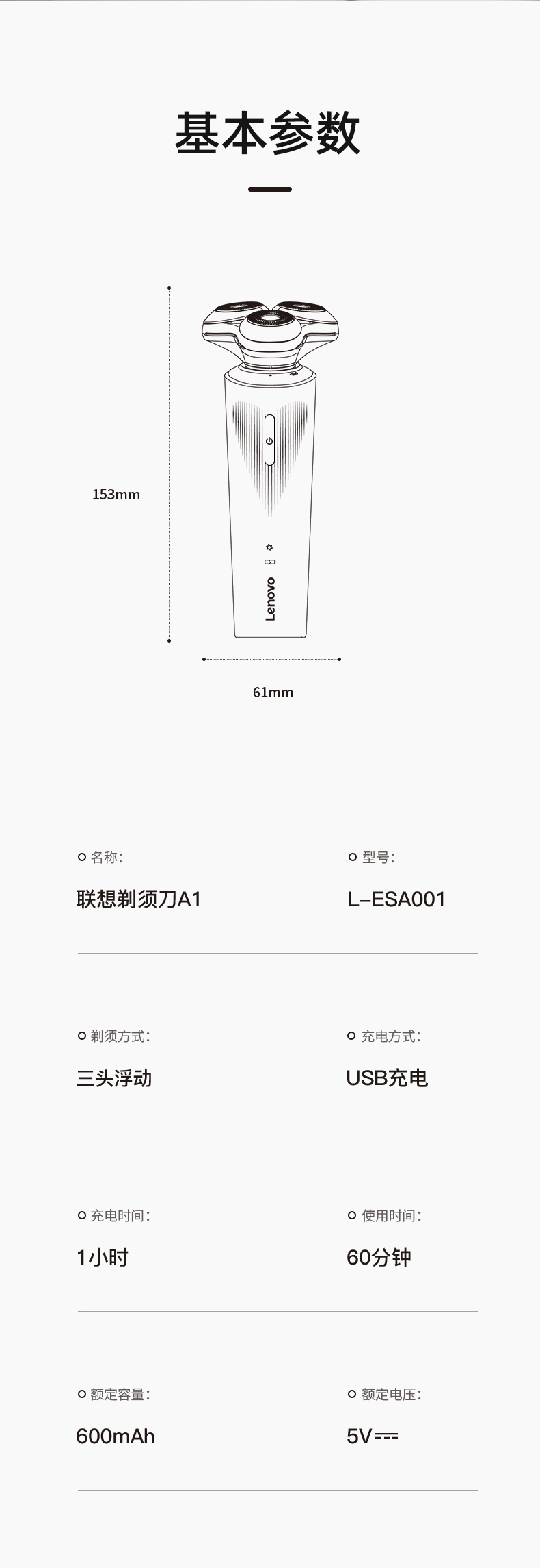 联想电动剃须刀A1型号L-ESA001容量600mAh