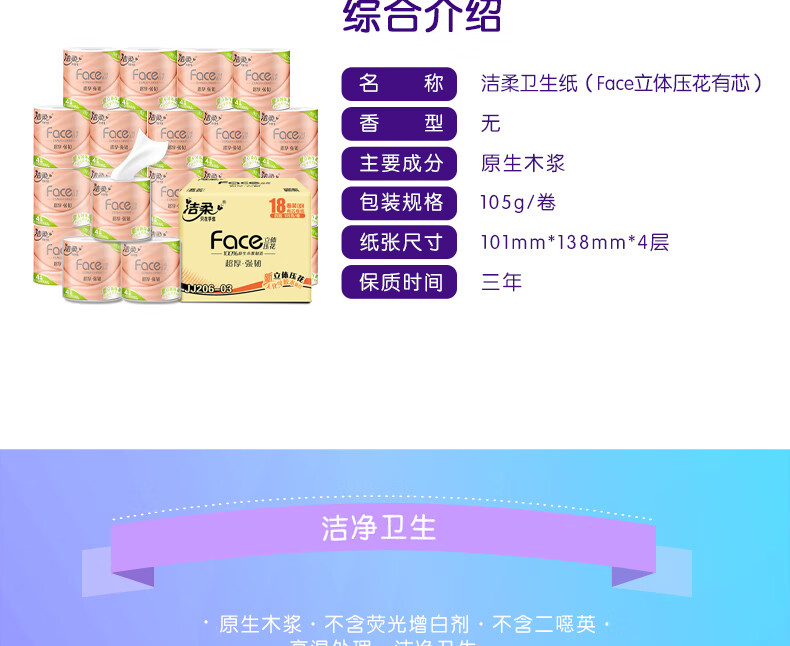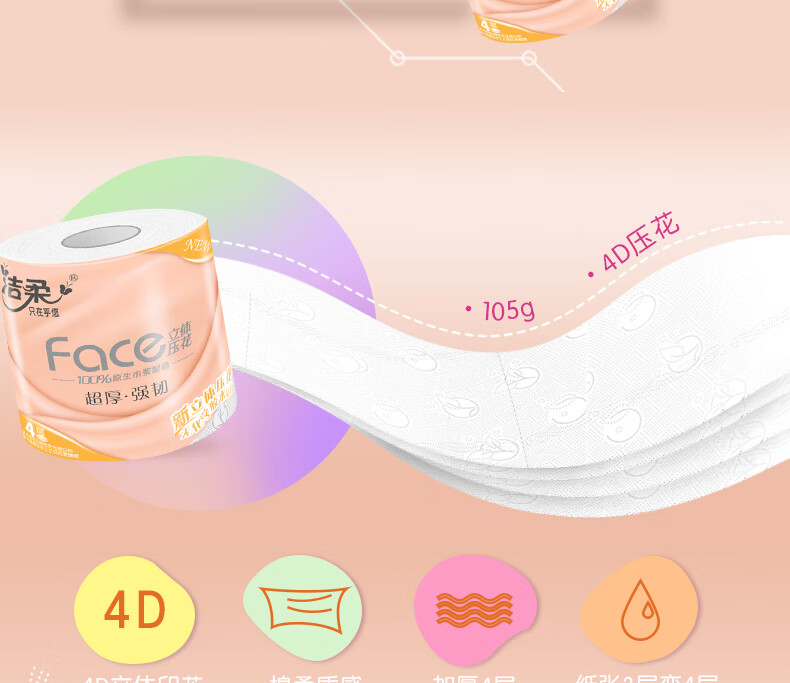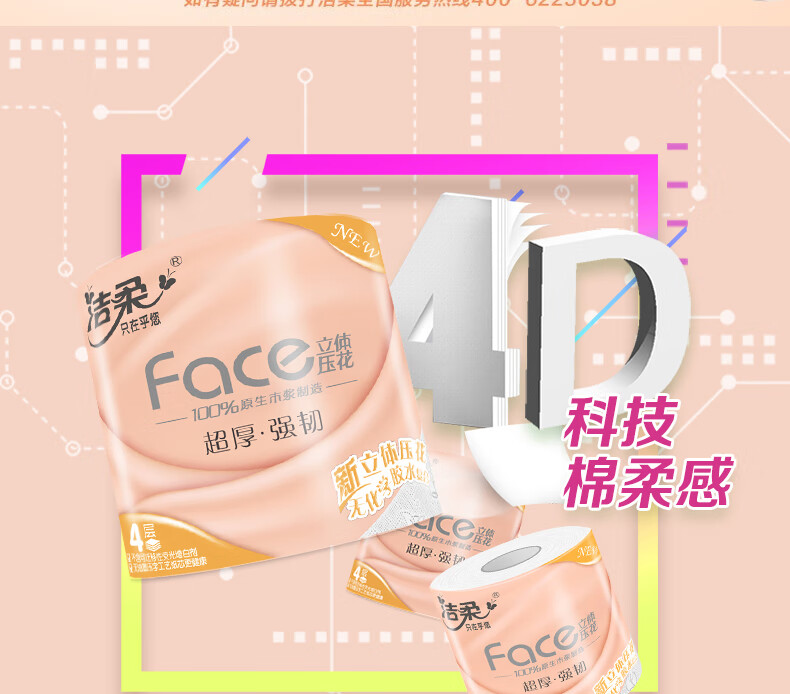 洁柔牌卫生纸棉柔感立体压花有芯4层18卷装