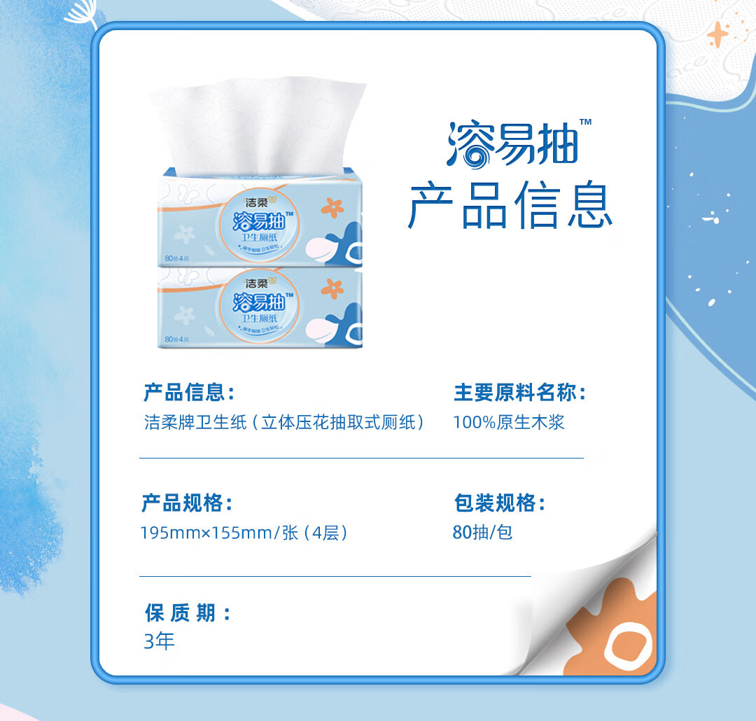 洁柔牌卫生纸立体压花抽取式厕纸80抽4层3包装 JT014-03E