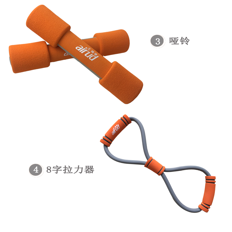 跳绳1条/握力器1个/哑铃2个/拉力器1条/计步器1个/布包1个(颜色随机)