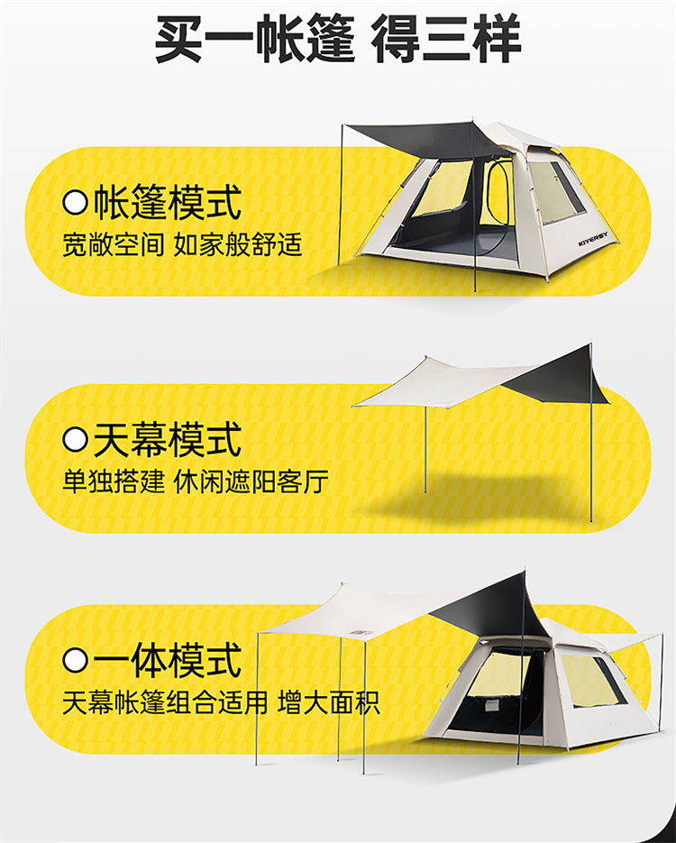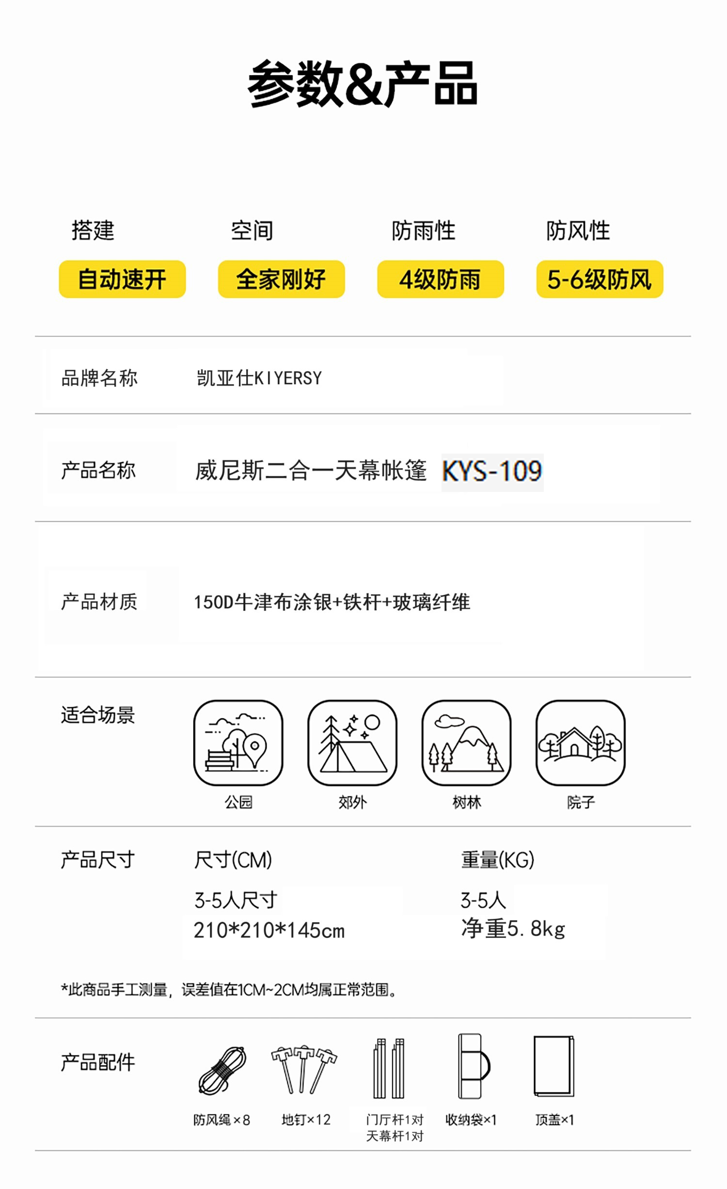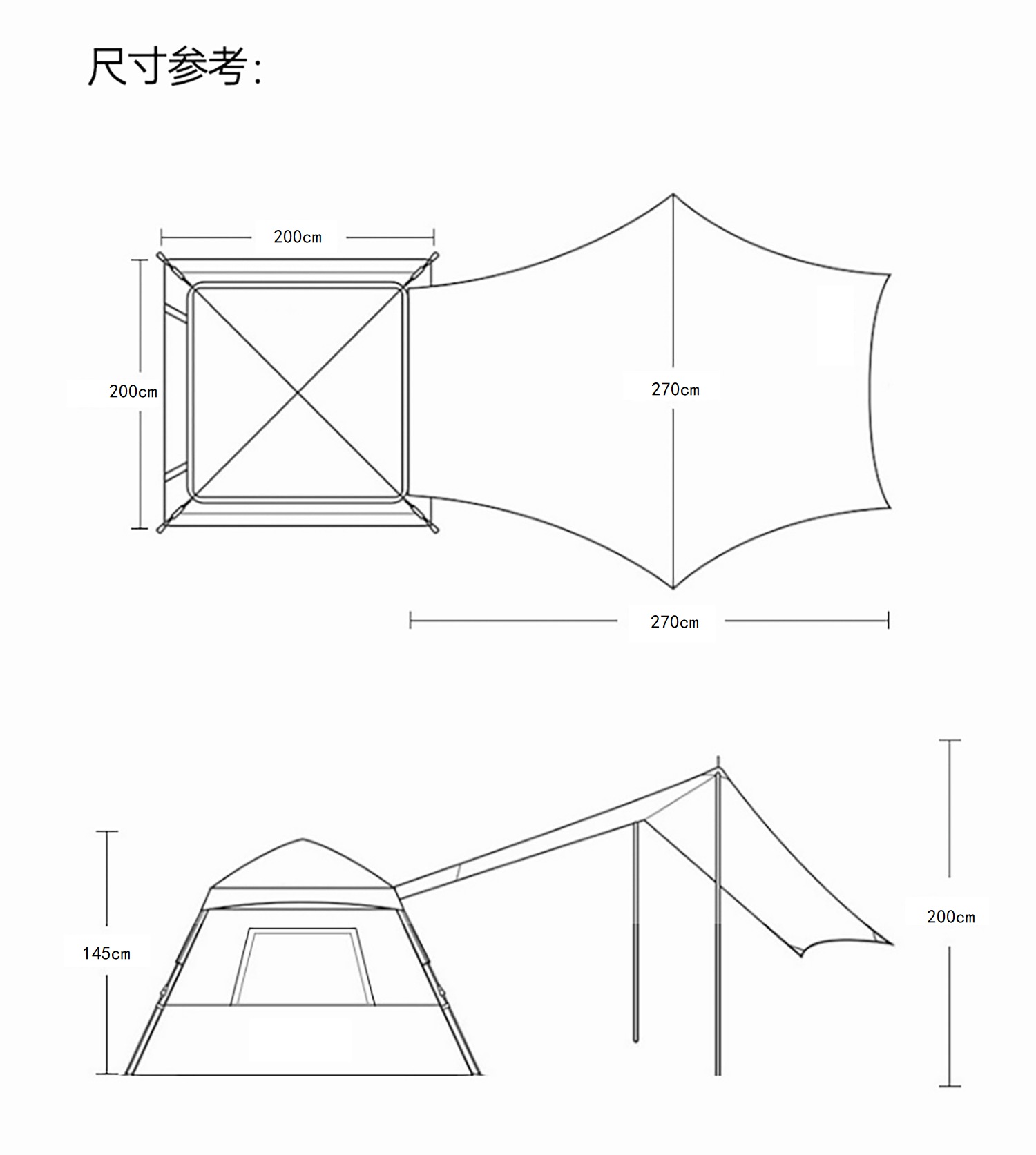 帐篷1个、天幕1个、门厅杆2根、天幕杆2根、地钉12根、防风绳8根