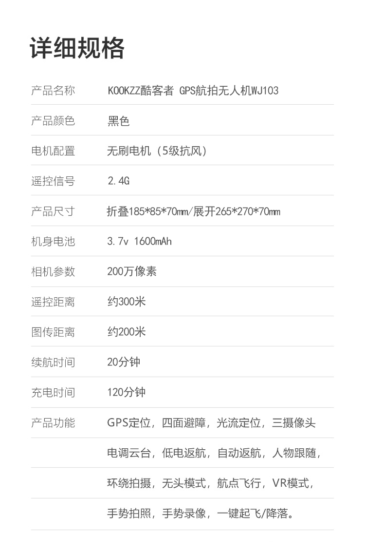 KOOKZZ酷客者 德国 WJ103无人机高清专业航拍GPS卫星定位智能避障远距图传儿童玩具无人遥控飞机
