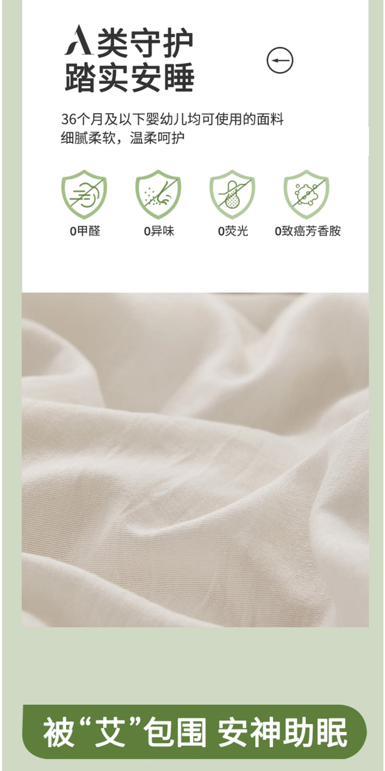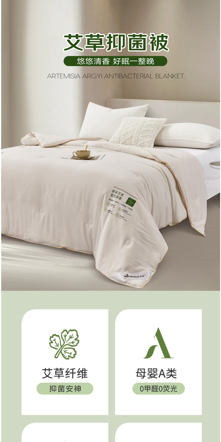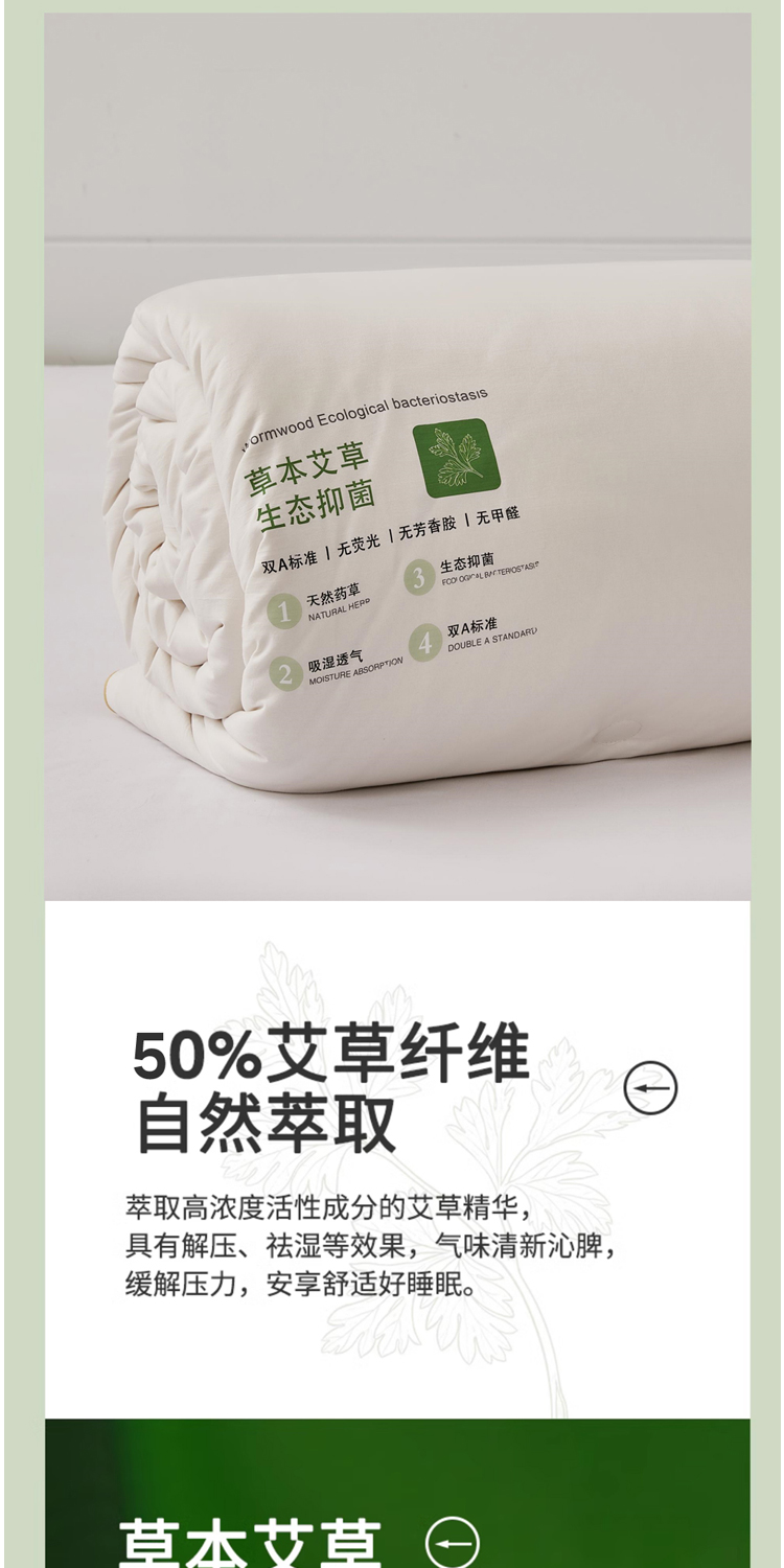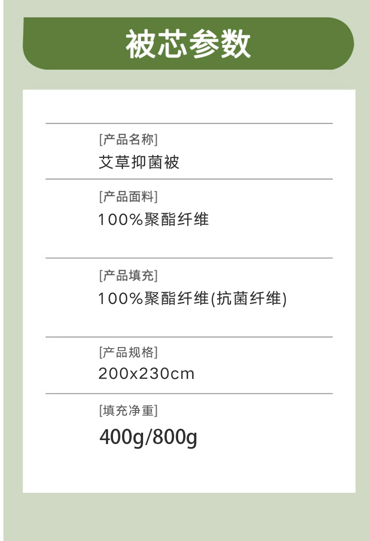 面料:100%聚酯纤维,规格:200*230CM, 填充:50%再生素纤维(艾草纤维)+50%聚酯纤维,净填充400克