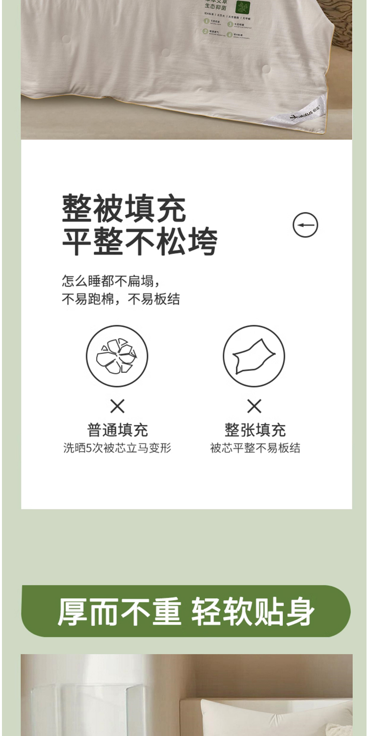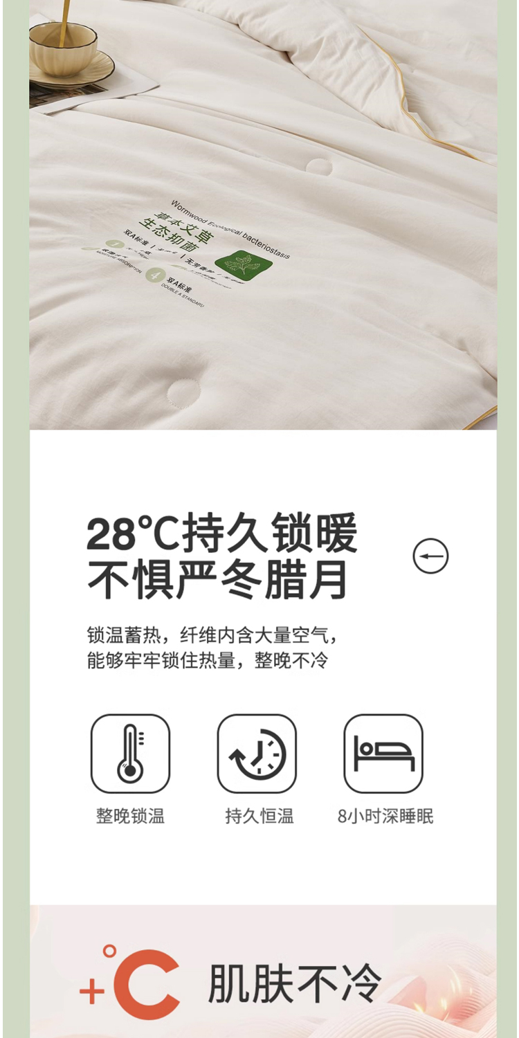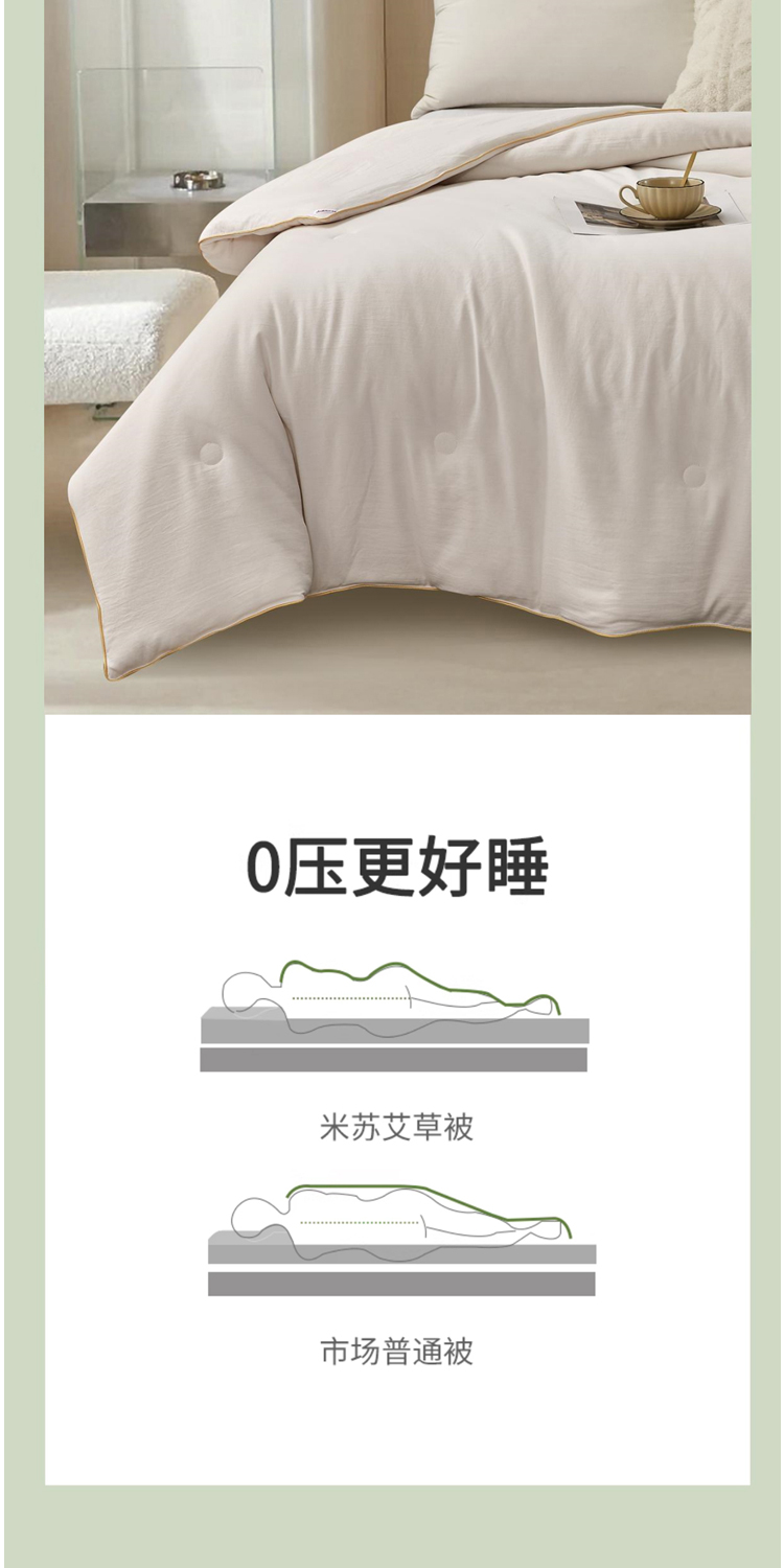 面料:100%聚酯纤维,规格:200*230CM, 填充:50%再生素纤维(艾草纤维)+50%聚酯纤维,净填充400克