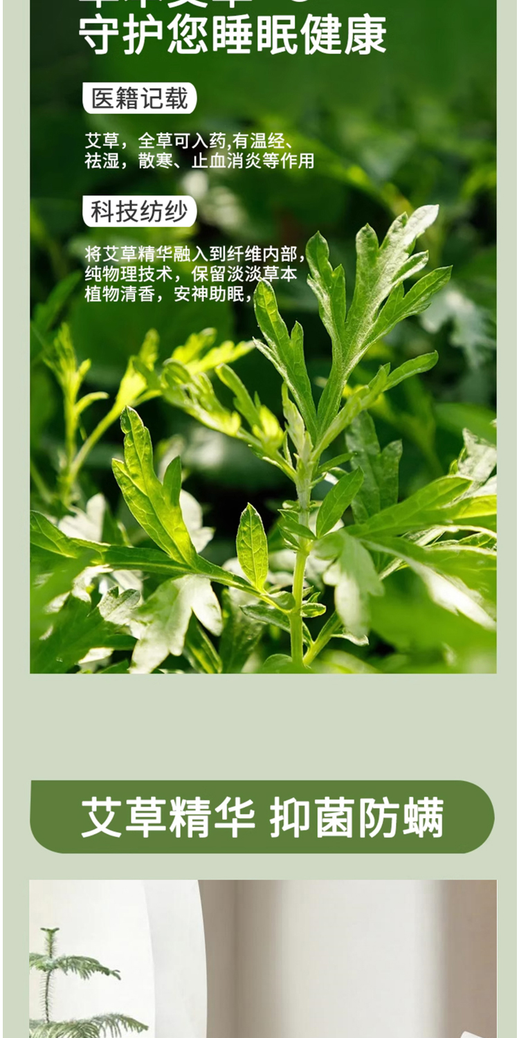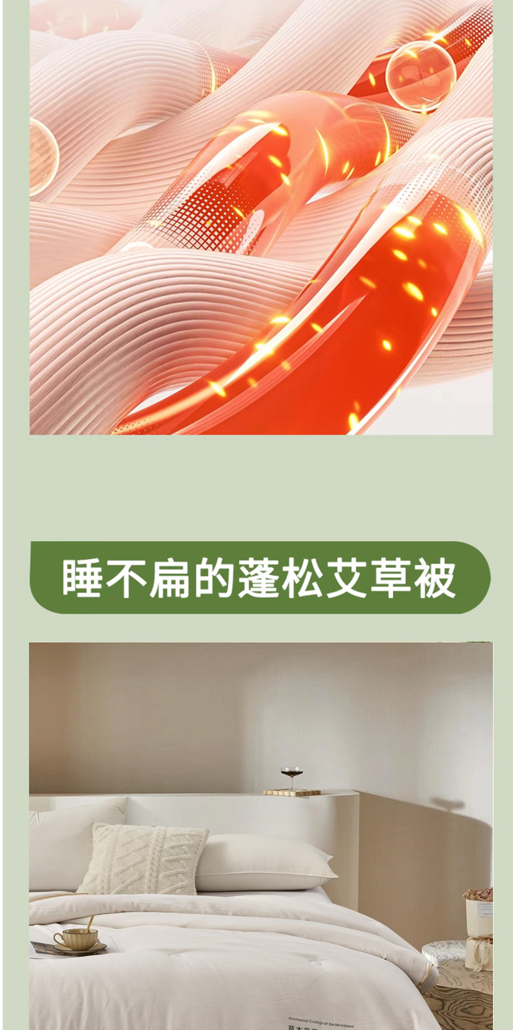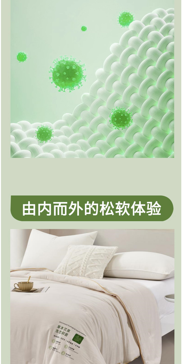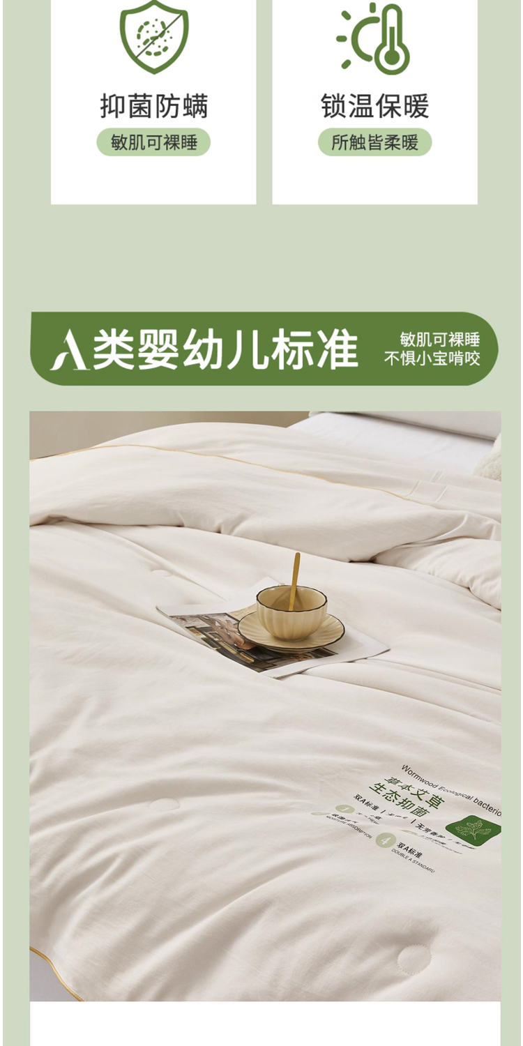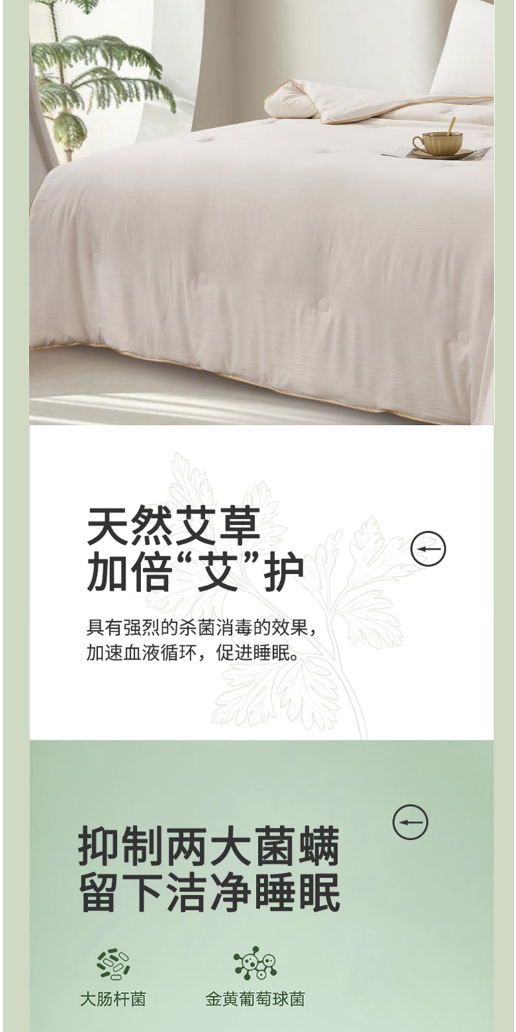 面料:100%聚酯纤维,规格:200*230CM,填充:50%再生素纤维(艾草纤维)+50%聚酯纤维,净填充:800克