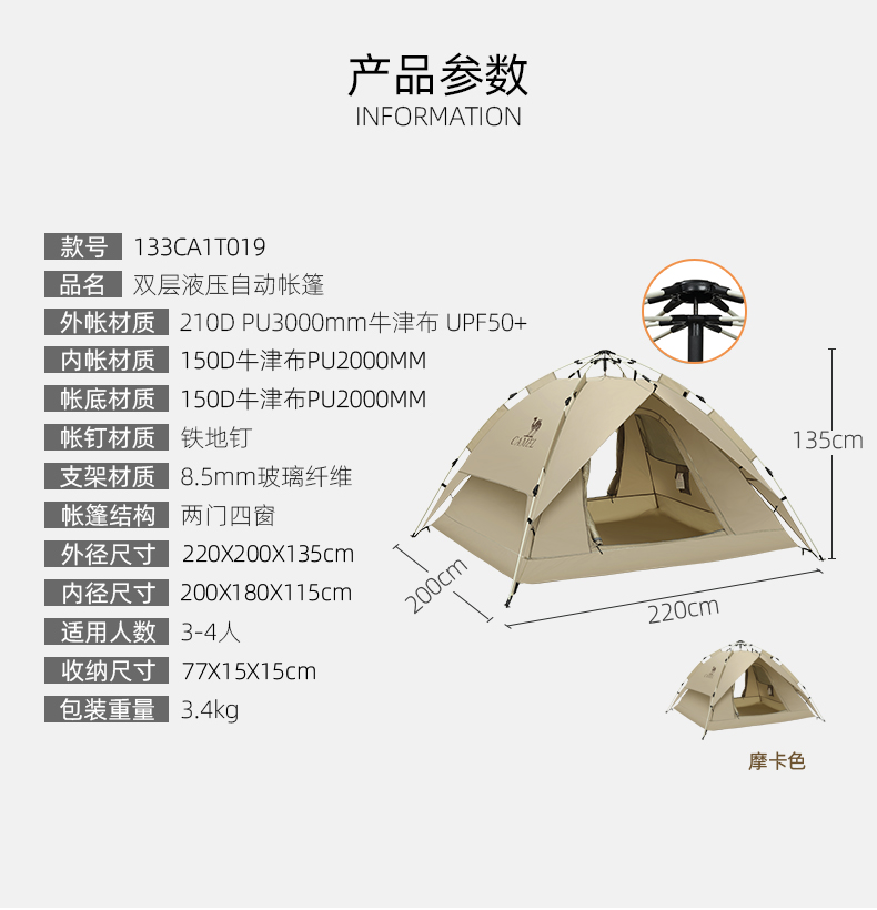 骆驼(CAMEL) 户外帐篷加厚便携式全自动 133CA1T019,摩卡色