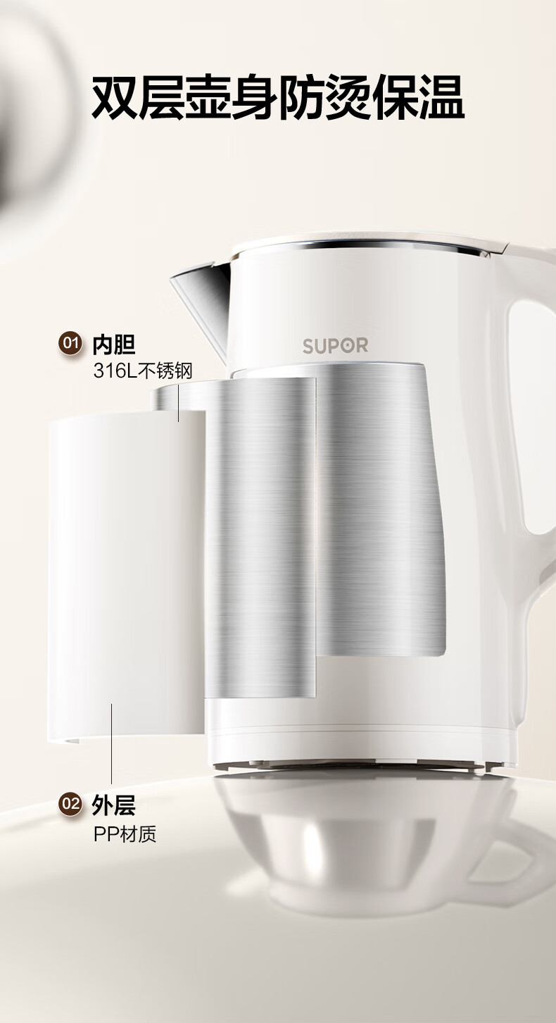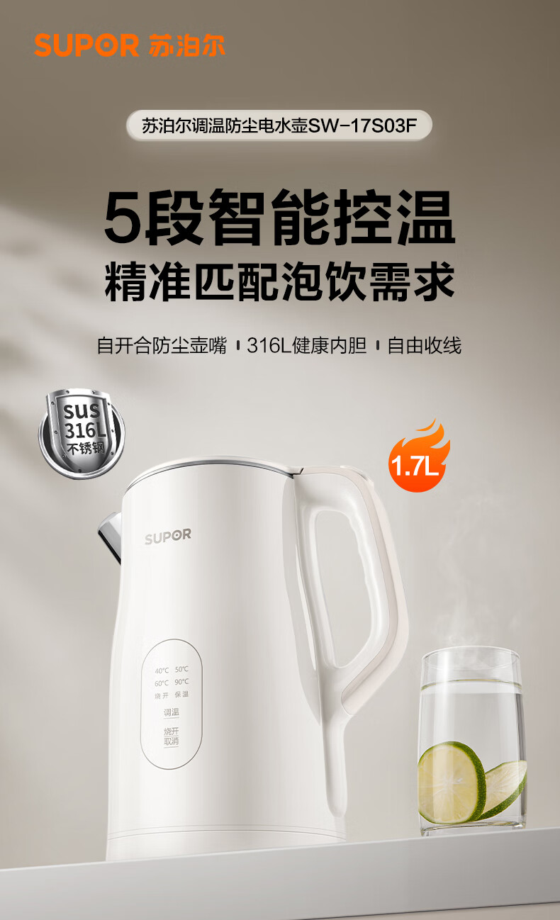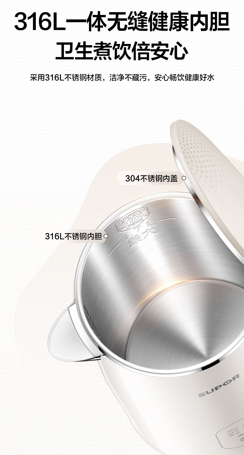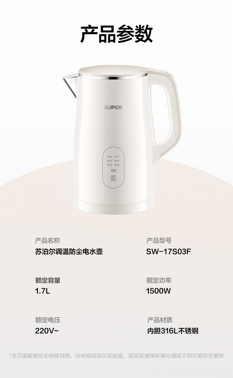 苏泊尔电热水壶家用无缝内胆大容量精准控温自动断电双层防烫低音烧水壶 1.7L 【316L不锈钢】SW-17S03F SW-17S03F