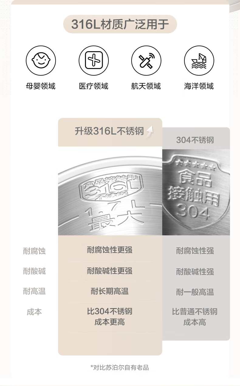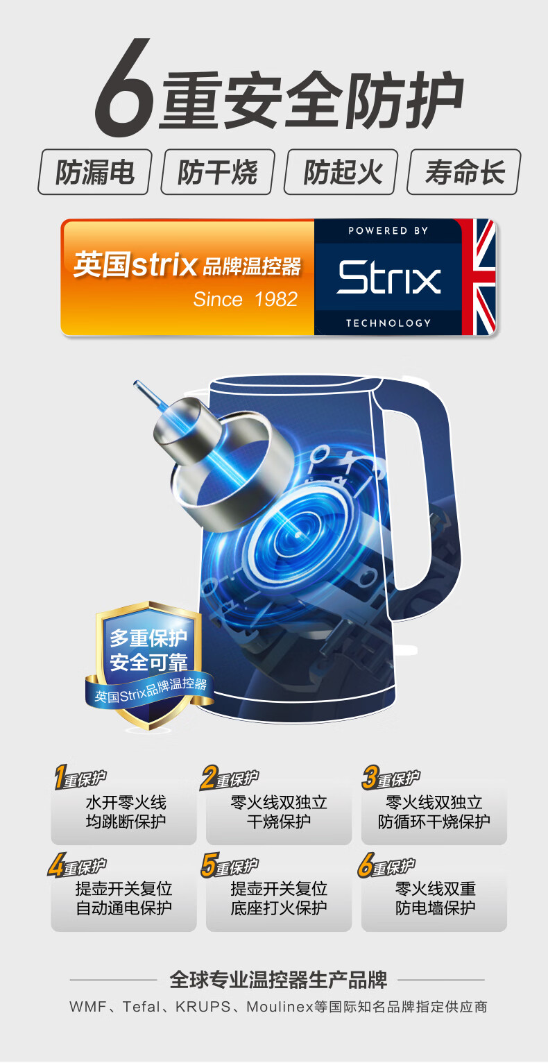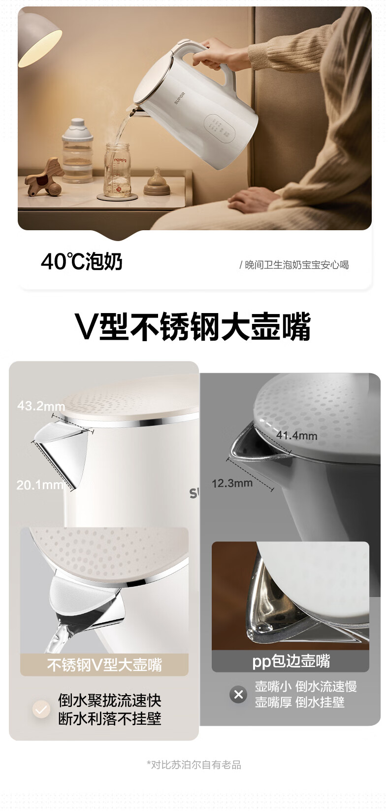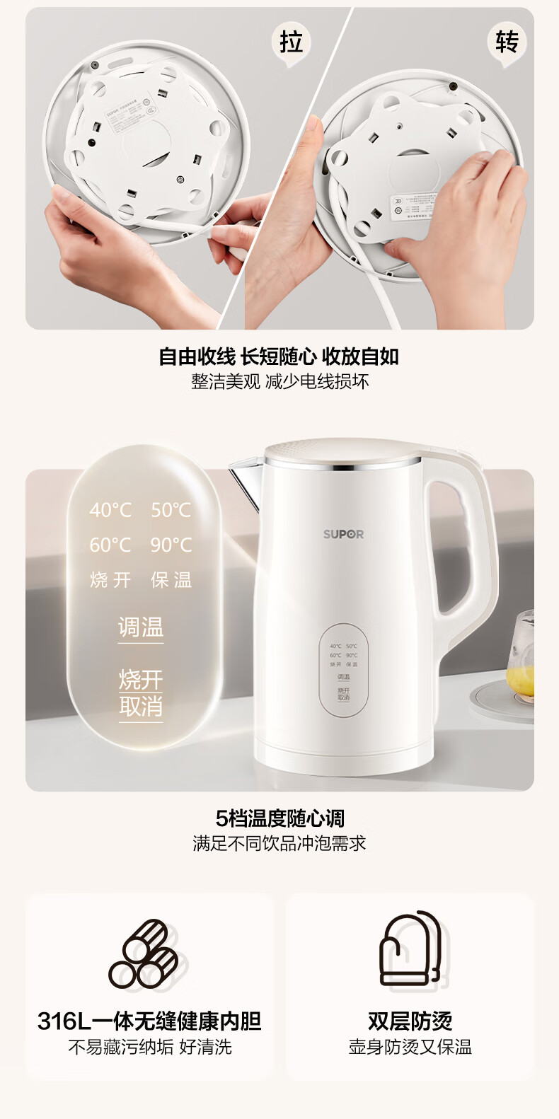 苏泊尔电热水壶家用无缝内胆大容量精准控温自动断电双层防烫低音烧水壶 1.7L 【316L不锈钢】SW-17S03F SW-17S03F