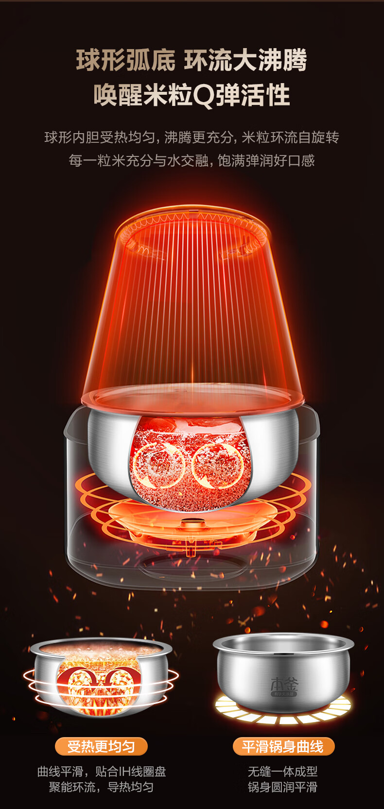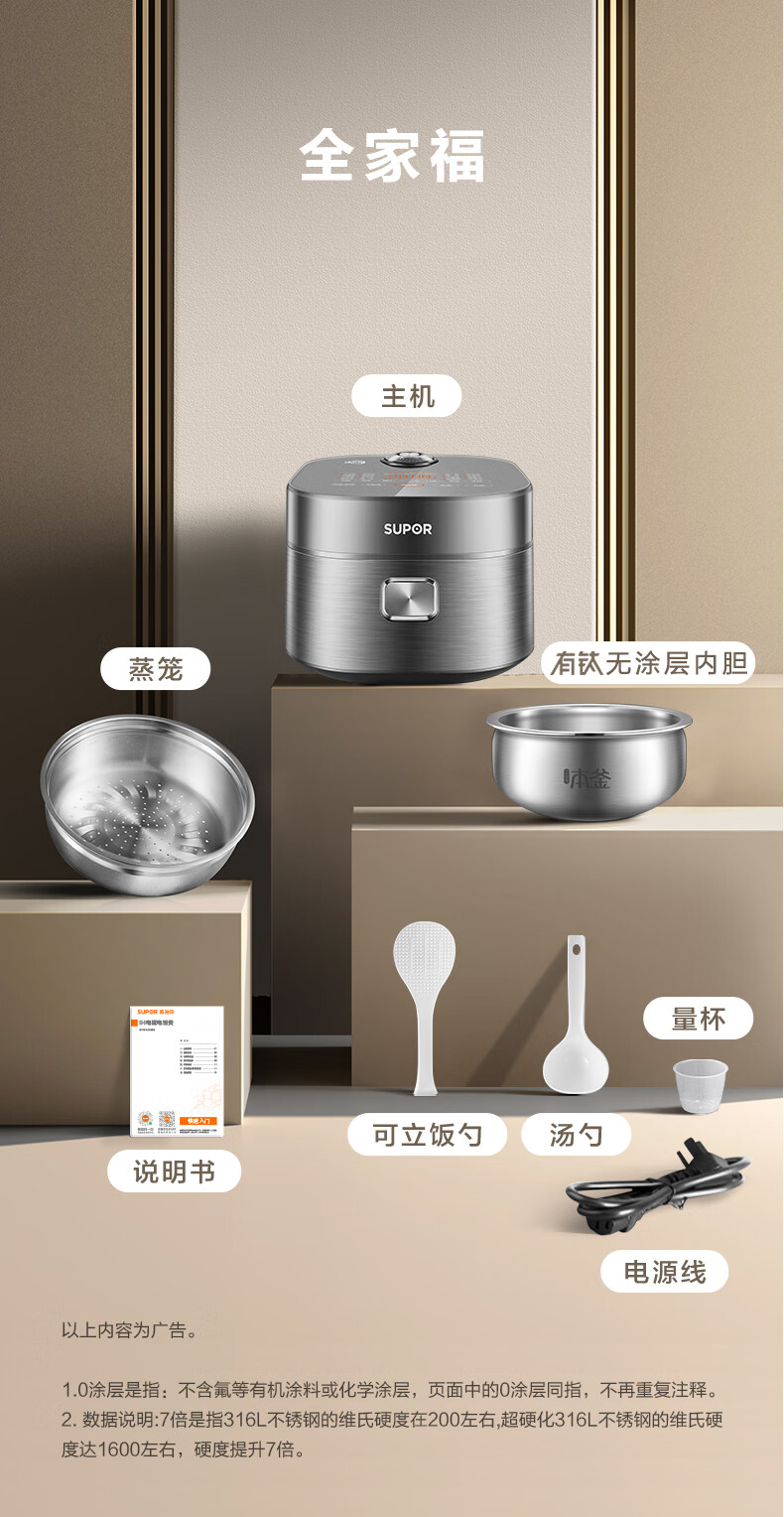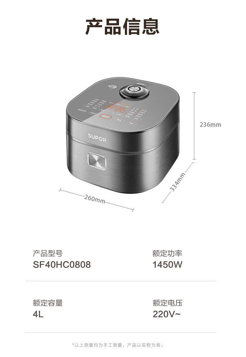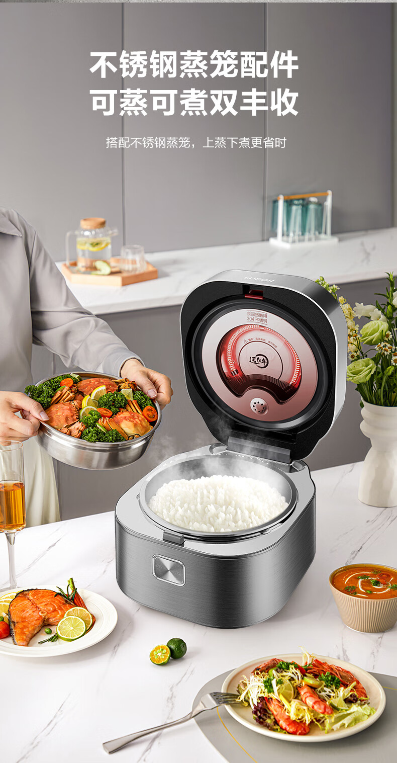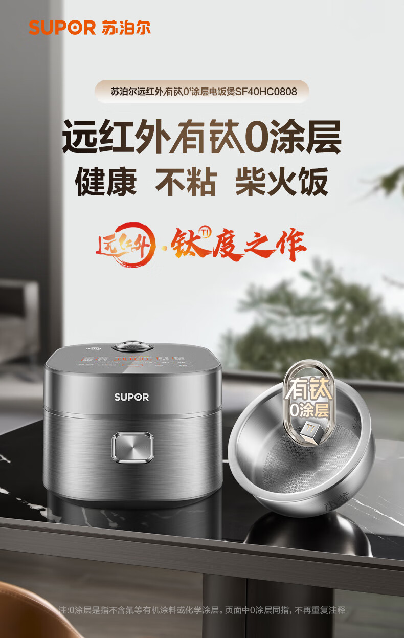 苏泊尔(SUPOR)远红外电饭煲有钛不粘0涂层4L无涂层电饭锅家用不锈钢球釜多功能智能预约3-5-8人SF40HC0808