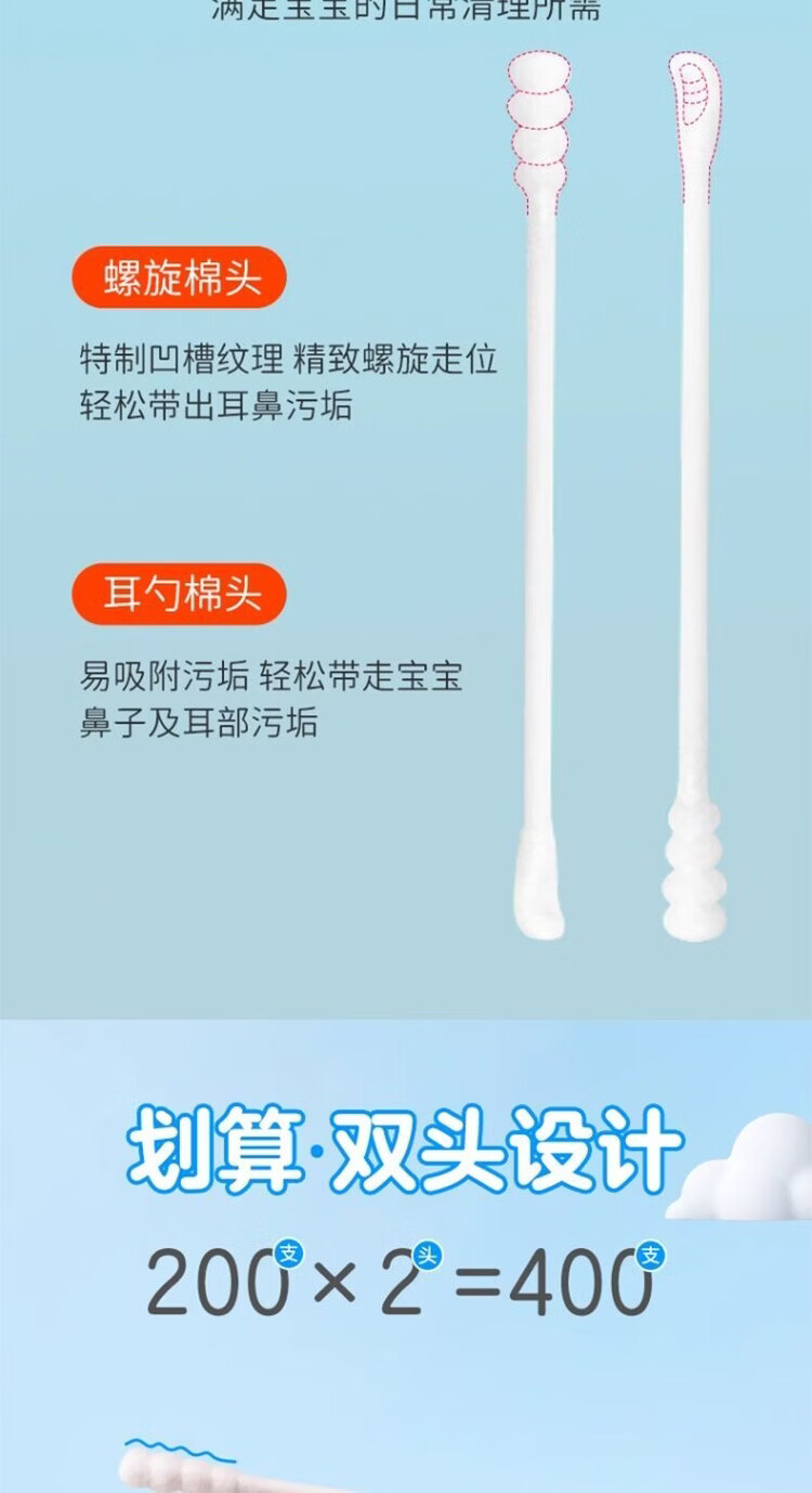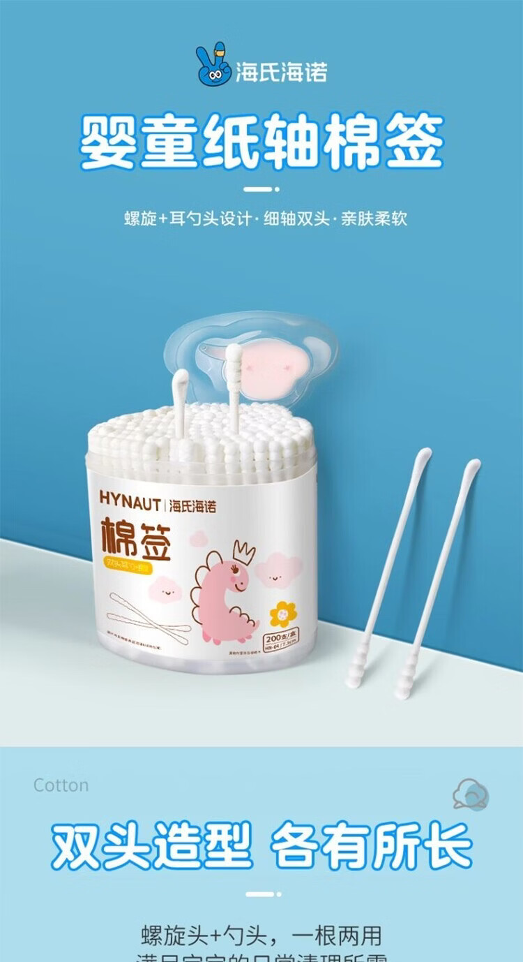 海氏海诺 A343棉签(双头-04 婴儿耳勺 螺旋)7.5cm*200只—1盒