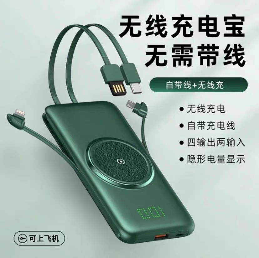 【ecreat】四合一充电宝10000毫安无线充自带四线适用苹果lightning华为type-c安卓Micro自带USB充电线 大容量小巧便携