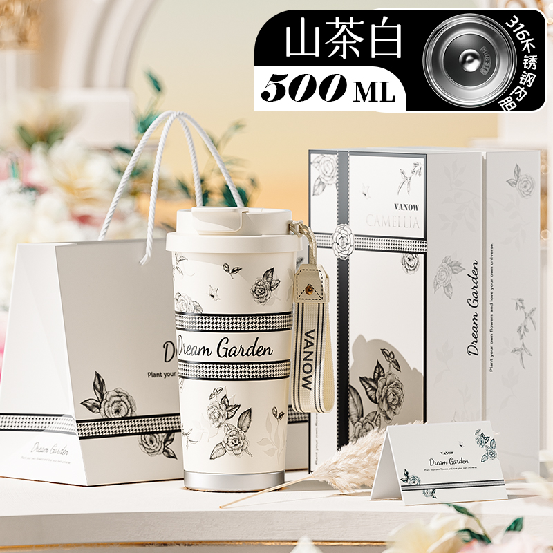 Vanow高颜值保温杯山茶白咖啡杯山茶白不锈钢内胆500ml