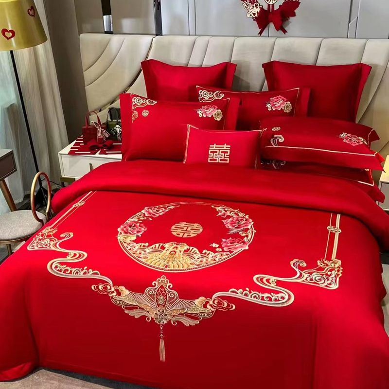 悠梦嘉居床裙款婚庆四件套双锦棉高档细腻面料刺绣缎面工艺婚庆凤天喜运